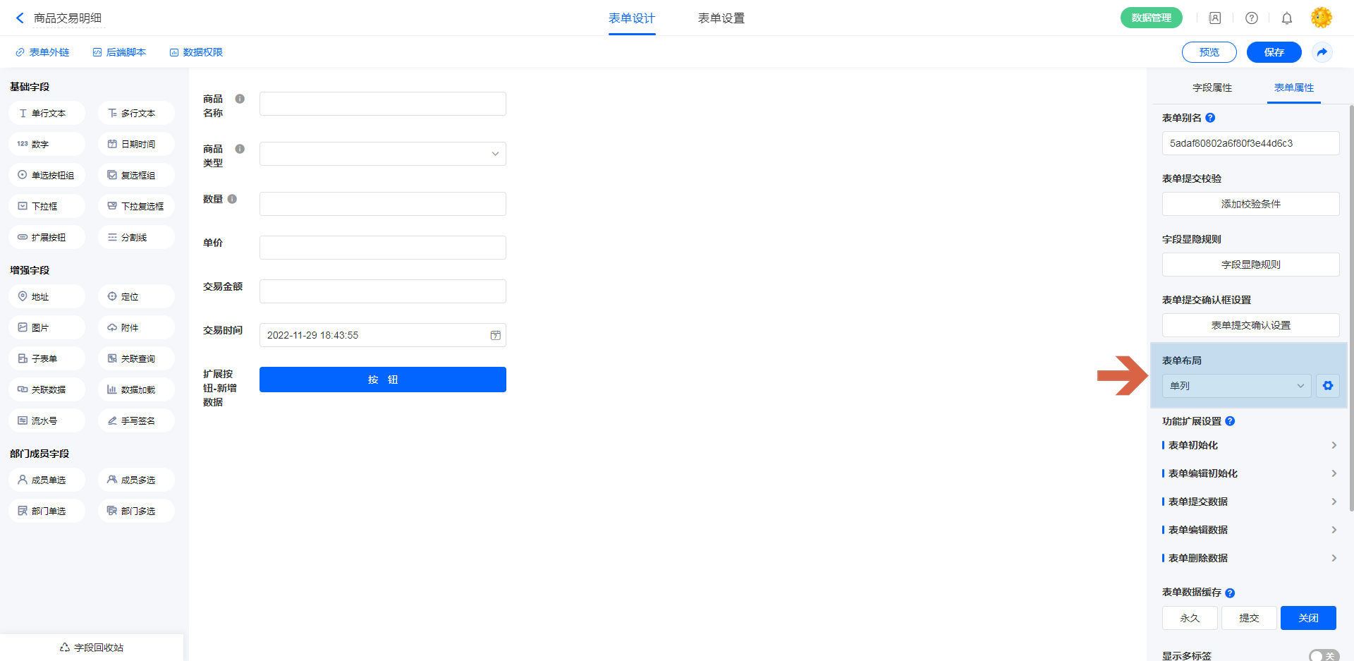 表单布局支持单列、双列、三列以及四列这四种排列方式。当遇到字段内容较多的表单,可以设置为三列、四列,减少成员滑动页面填报的频率。