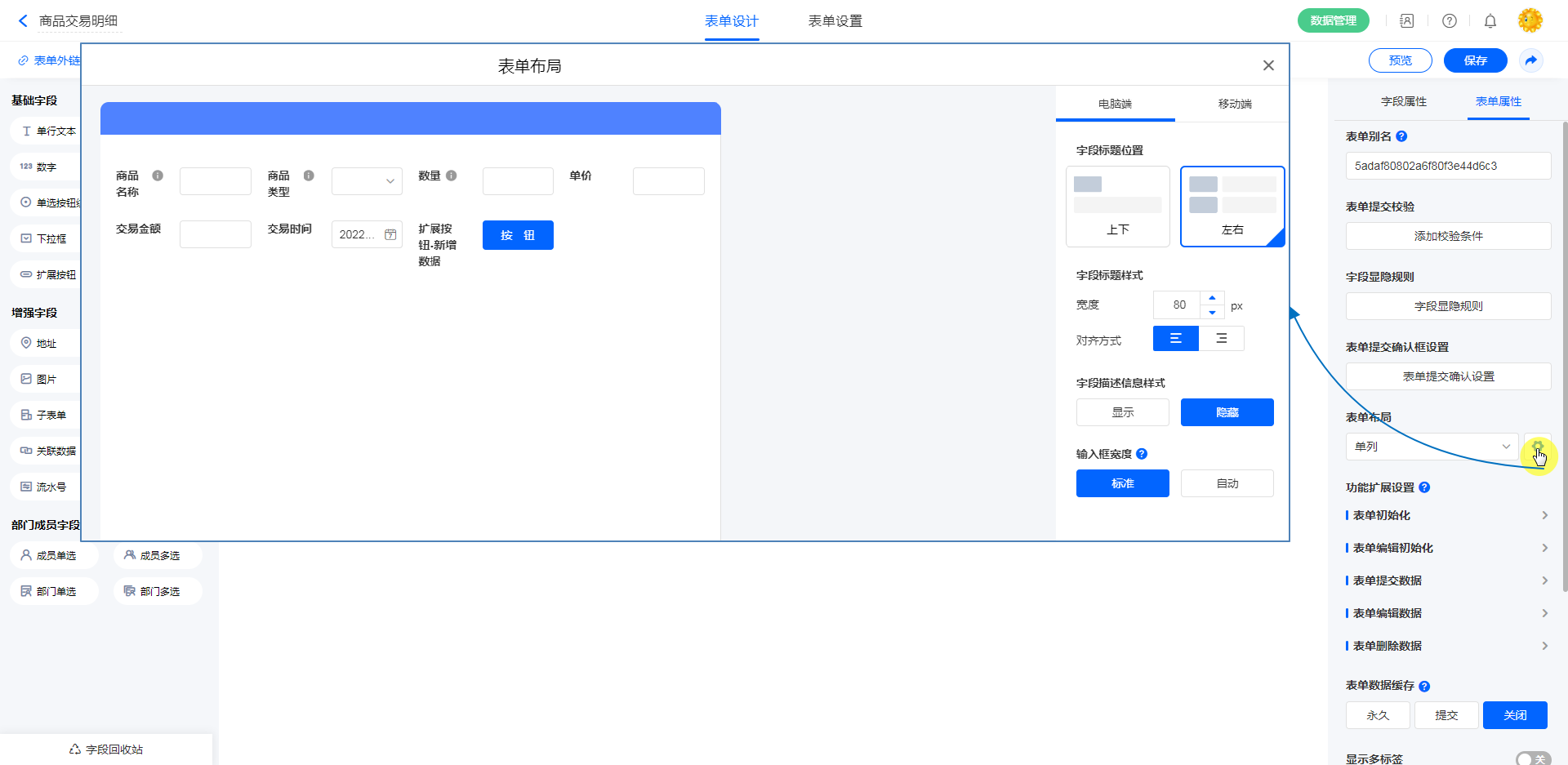 移动端设置,字段标题可以设置为 [左右] 和 [上下] 两种位置布局方式。