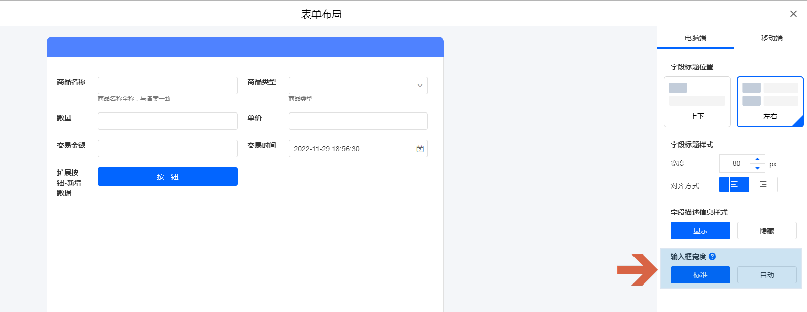 • 自动:当表单页面变宽时,输入框 100% 占满屏幕列宽。