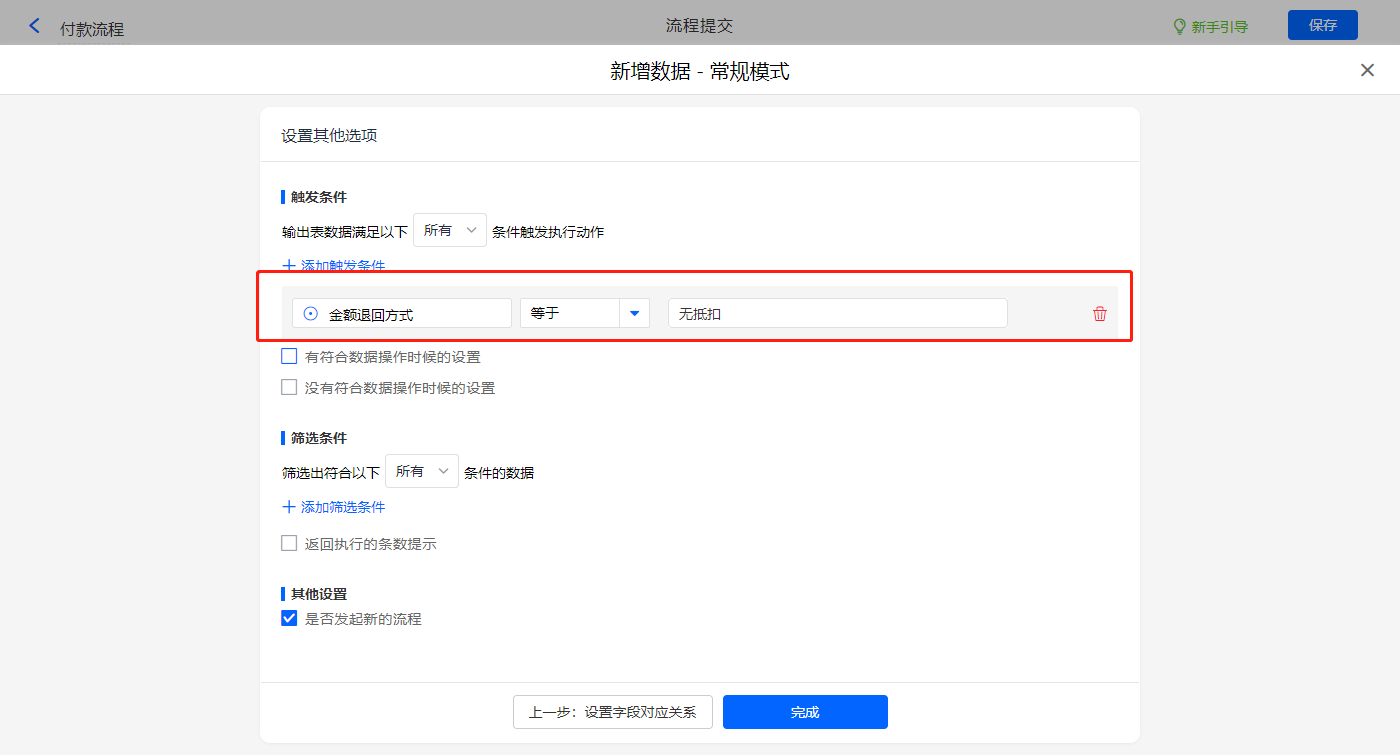 退回方式为无抵扣,退货收货后新增付款数据并发起流程;