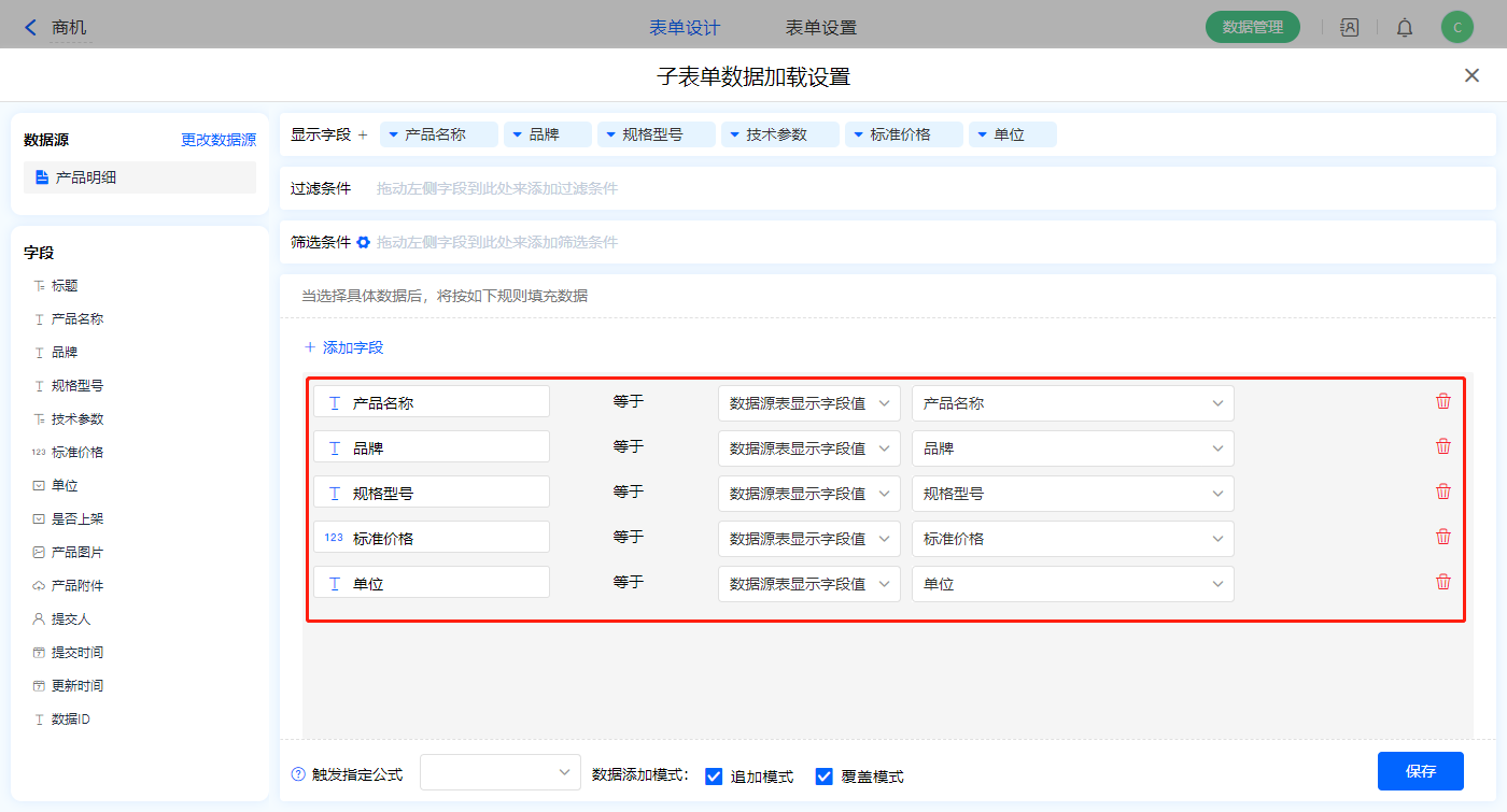 5)【商机明细】该子表单字段开启数据加载,更名为选择产品;