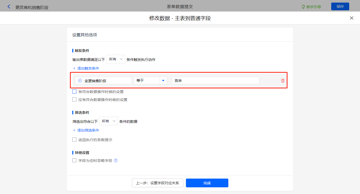 触发条件设置为当【变更销售阶段】字段等于【赢单】,则修改主表【销售阶段】、【阶段变更时间】、【阶段类型】三个字段的值;