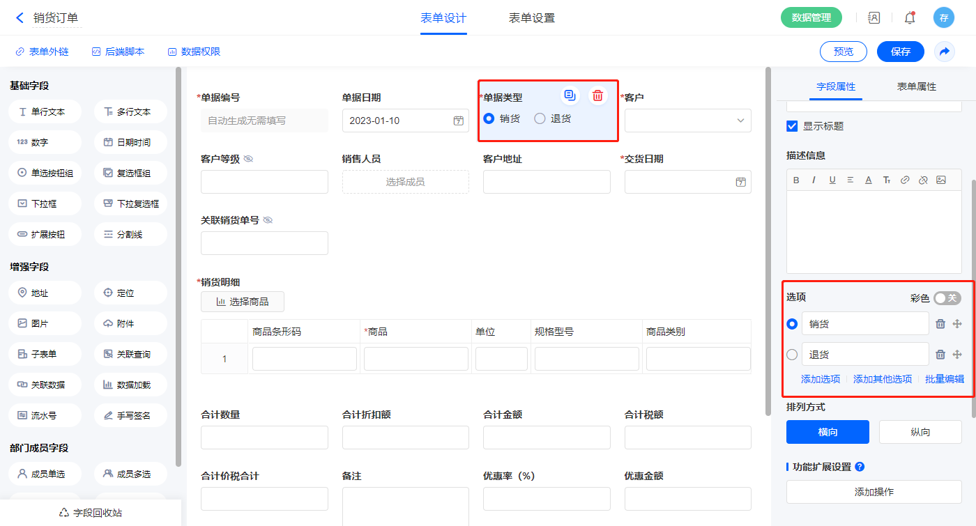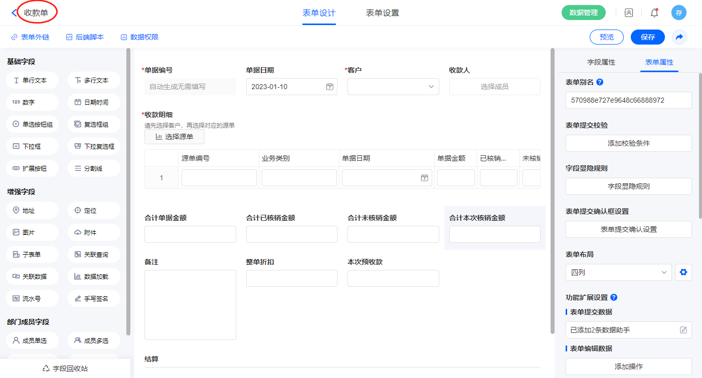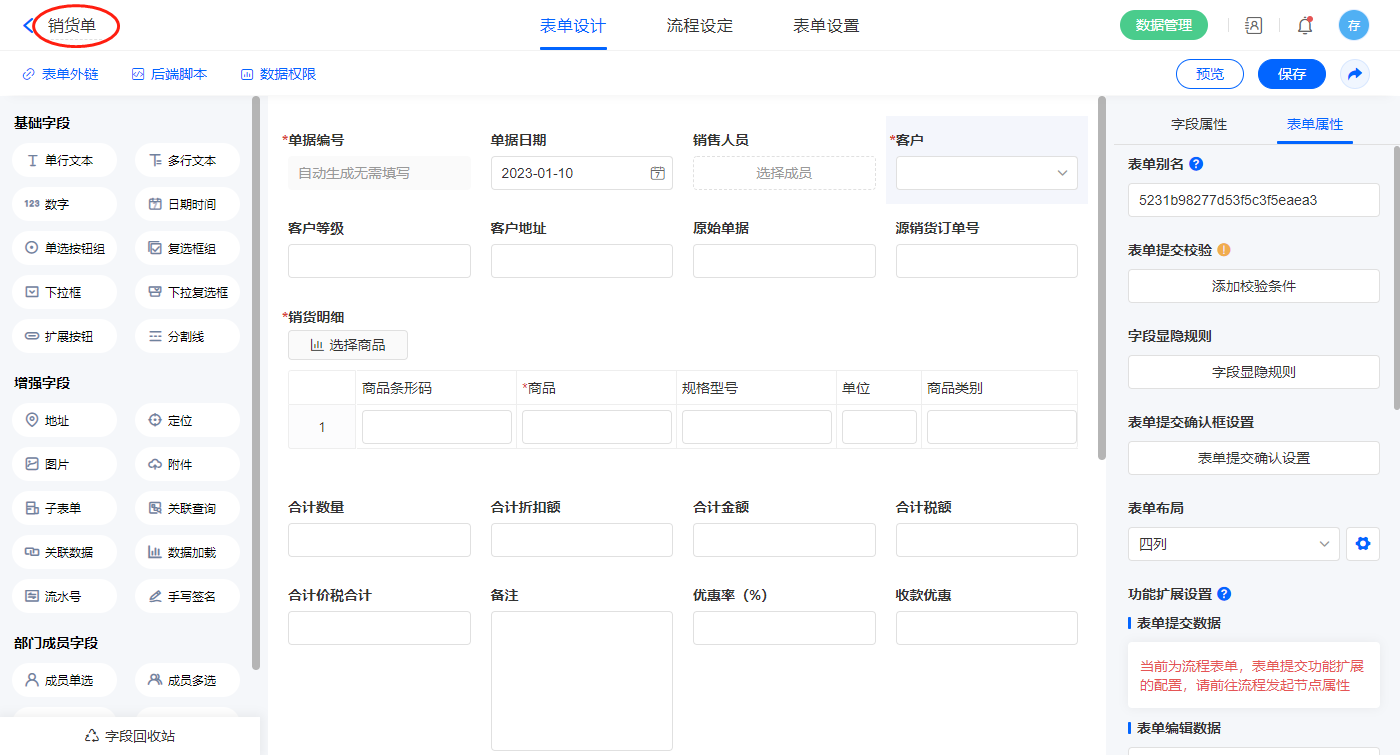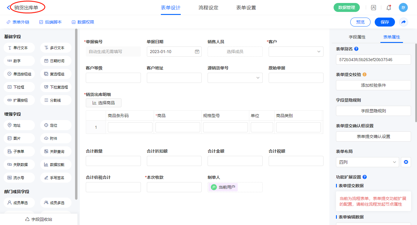 2.12、表单【销售开票记录表】字段及表单属性设置
