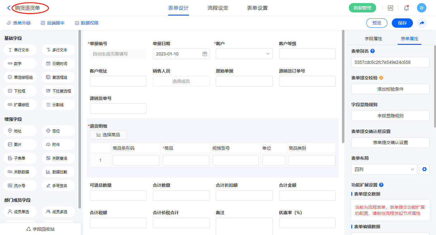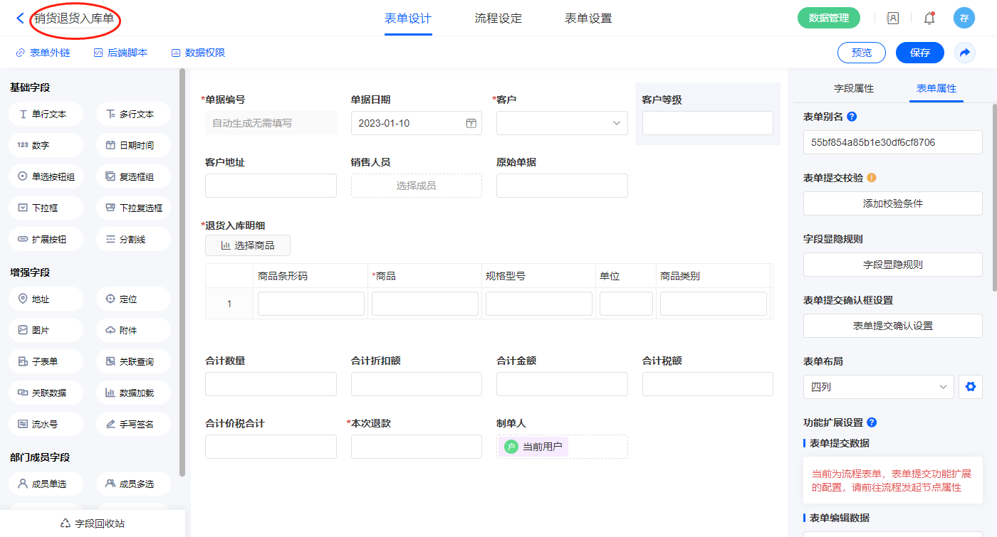 2.7、表单【销货退货入库单】字段及表单属性设置