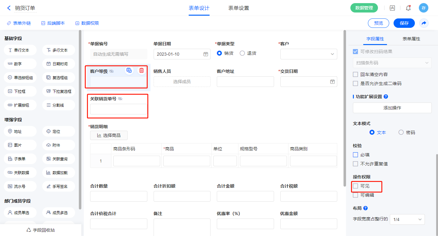 3)【整单折扣】、【本次预收款】两个字段设置不可见;