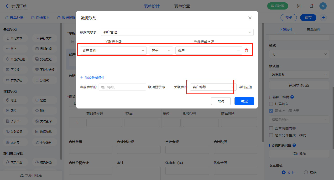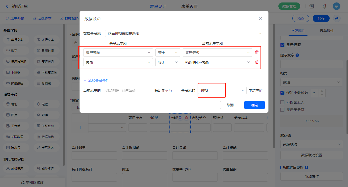 2)选择【源购货单号】字段,设置选项为其他表单数据,关联销货单的【单据编号】字段;