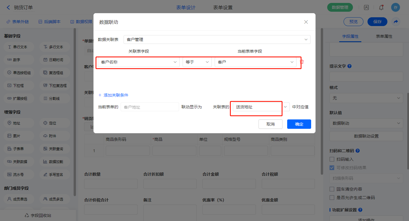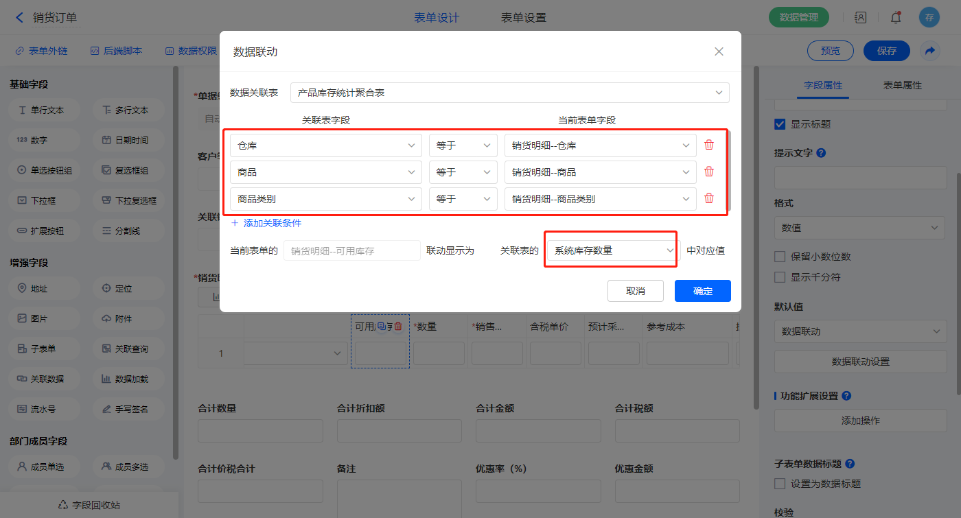 选择关联表单为表单【销货单】,添加该表的子表单字段对应表单的字段,设置完成点击【保存模块设置】;