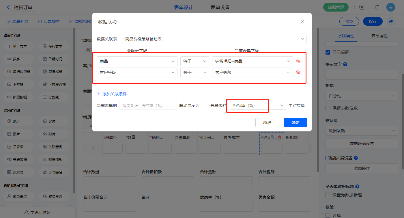 1)选中【收款明细.已核销金额】字段,设置默认值为数据联动,设置联动条件及联动字段;