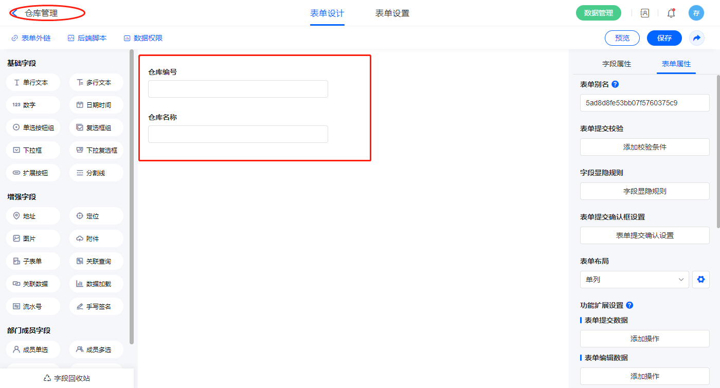 3)【调拨明细.调入仓库】、【调拨明细.调出仓库】字段,选择设置为关联其他表单数据,关联仓库管理的【仓库名称】字段;