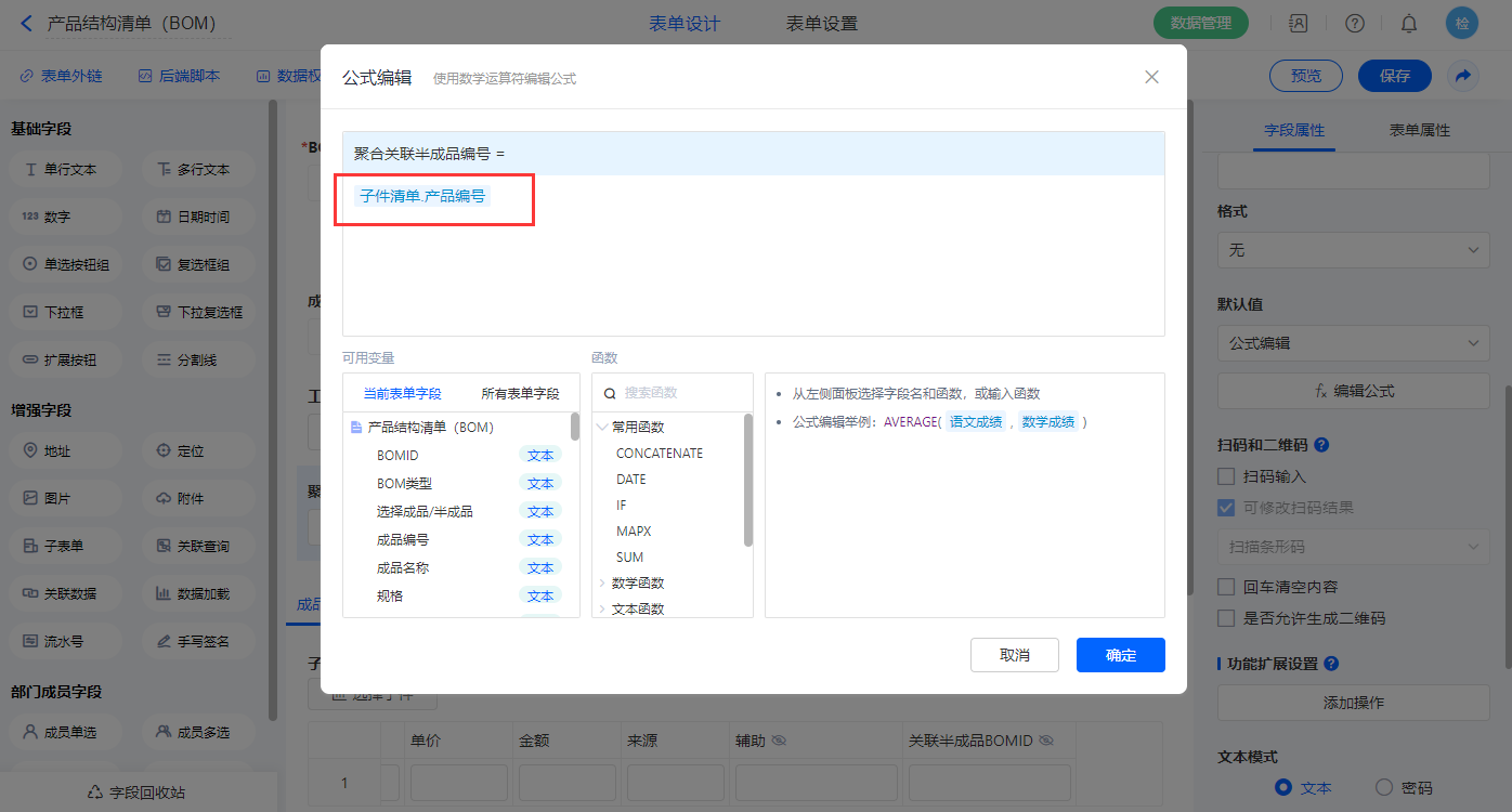 【子件清单.关联半成品BOMID】字段,设置默认值为公式编辑,如图设置公式;