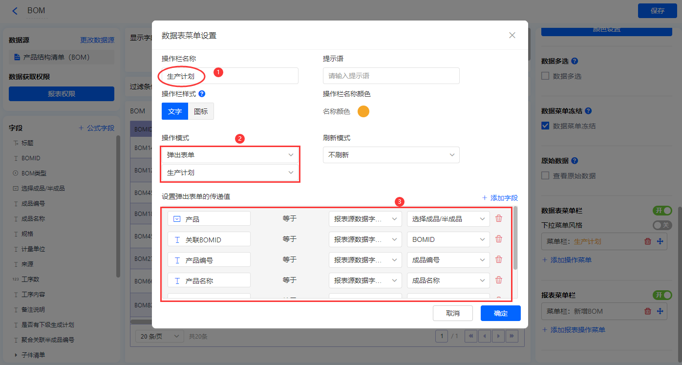 【生产计划】的菜单栏,操作模式设置为弹出表单【生产计划】;