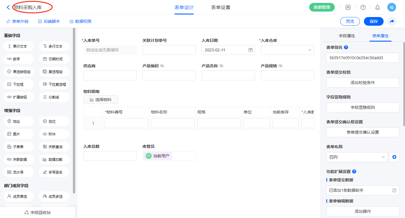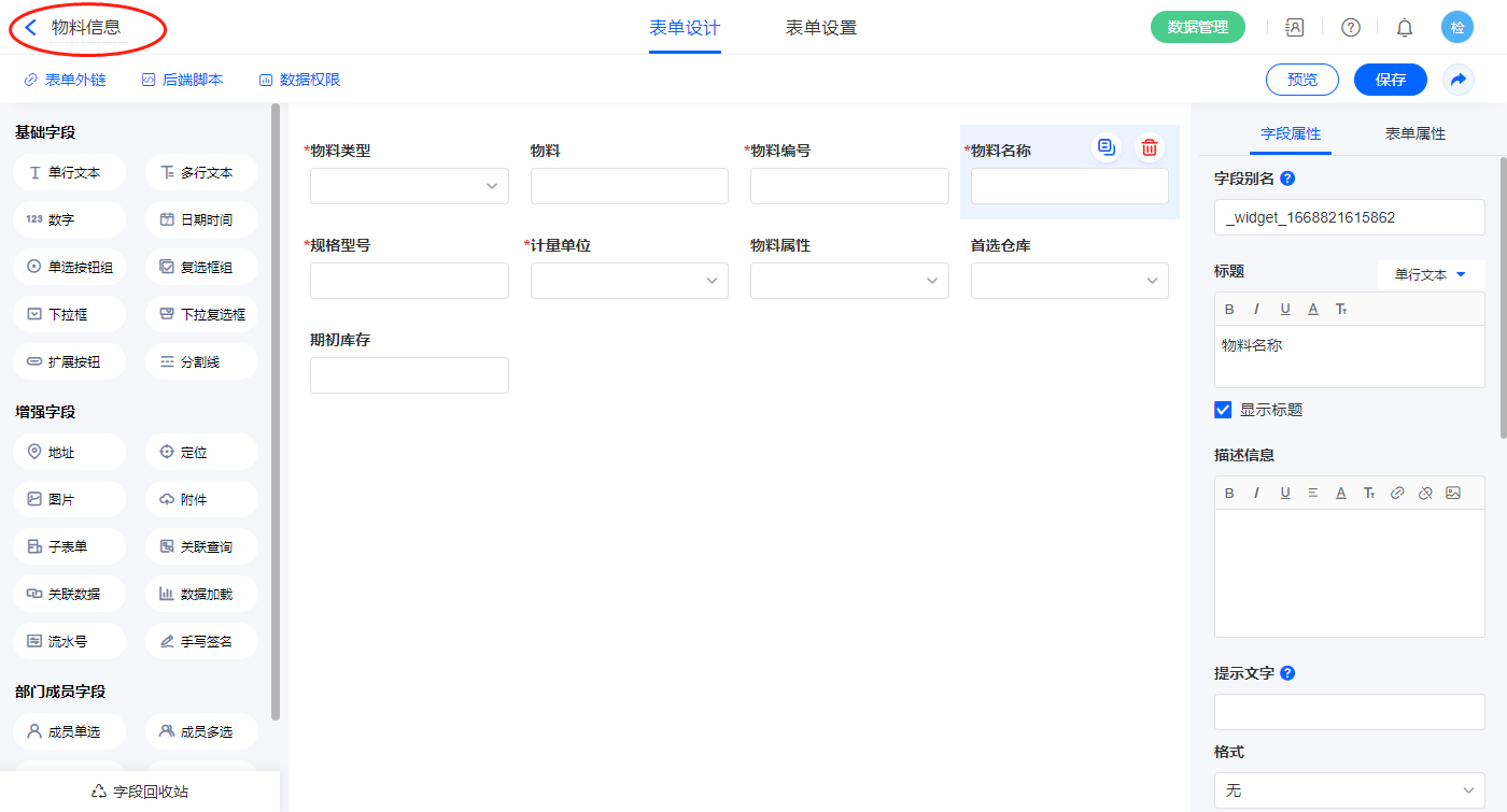 1)【物料明细】子表单开启数据加载,数据源为【物料信息】,添加显示字段设置赋值字段及筛选条件,点击保存;