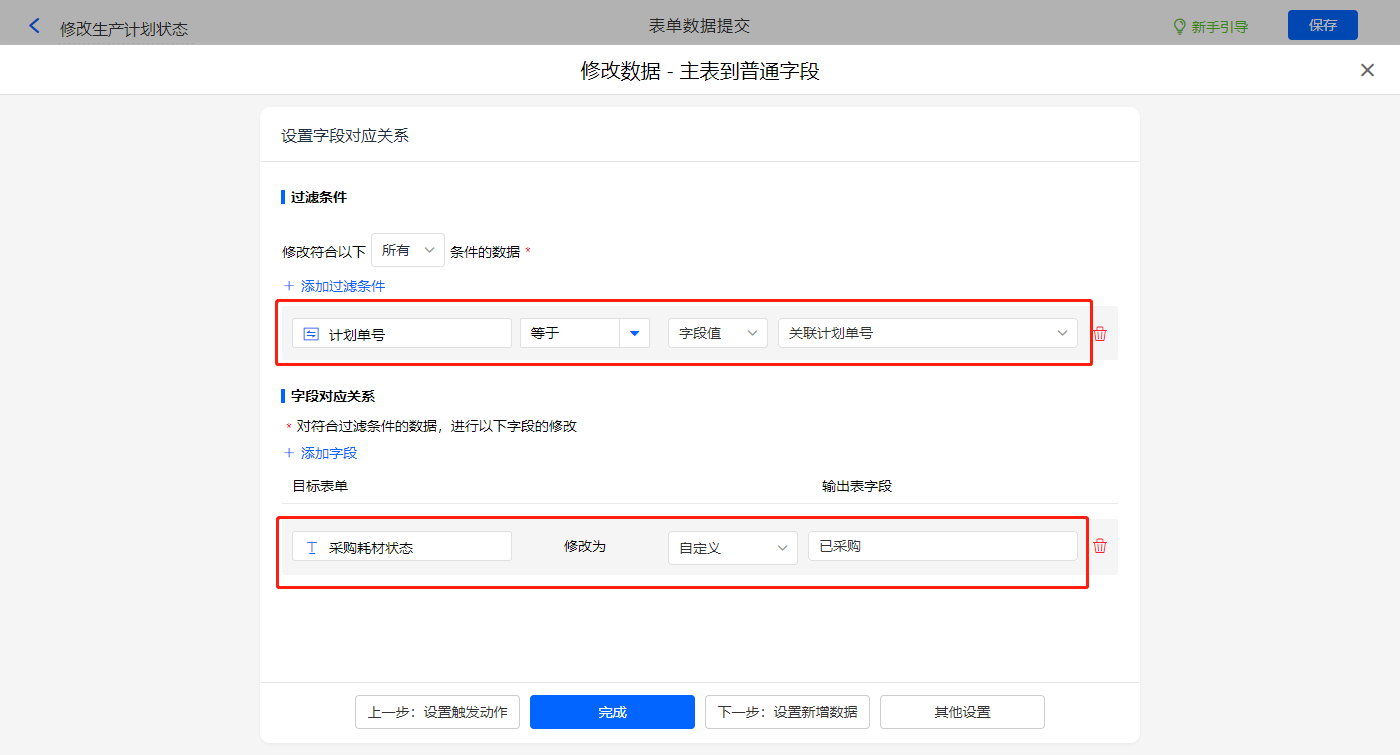 名称为修改生产计划状态,新增修改数据的执行动作,选择修改【生产计划】表单,选择对应过滤条件,以及需要修改的字段,设置好点击【完成】并保存该数据助手;