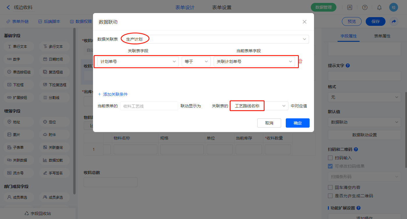 2)【工艺路线编码】、【工艺路线】、【计划生产数】设置默认值为数据联动,关联表及关联条件相同,设置对应的联动字段即可;