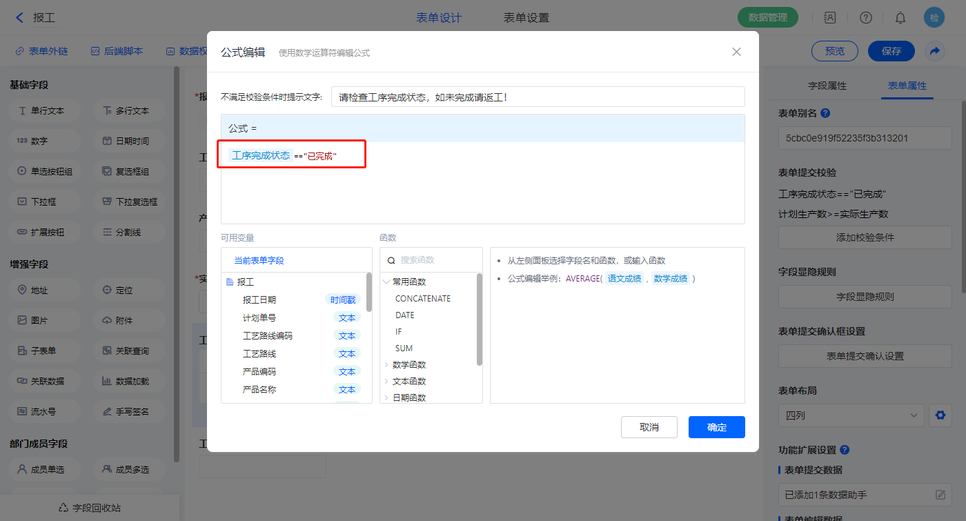 当公式“工序完成状态=="已完成"”不满足提交时报“请检查工序完成状态,如未完成请返工!”提示;