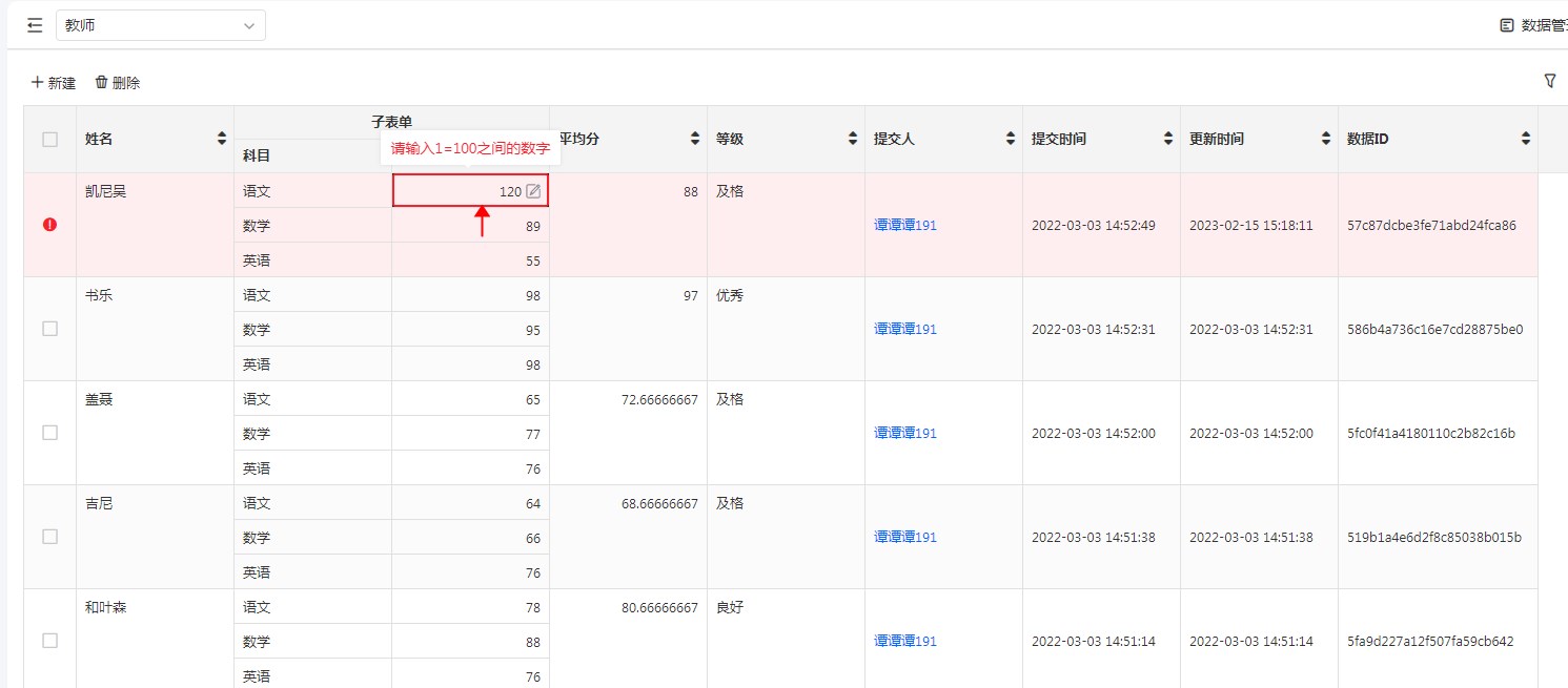 - 数据管理处快捷编辑数据时,不触发表单提交校验、数值范围校验、必填校验等,触发重复值校验、聚合表校验、扩展体系、联动和公式等。