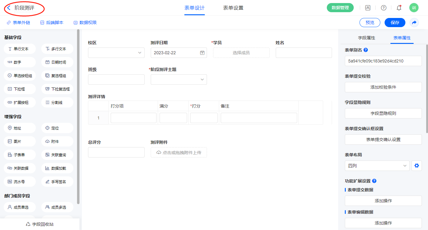 【阶段测评】的菜单栏,操作模式设置为弹出表单【阶段测评】;