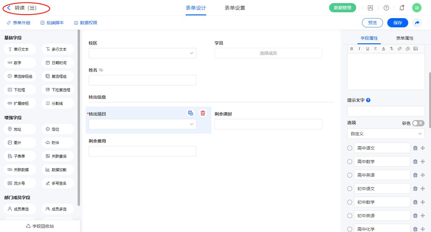【转课】的菜单栏,操作模式设置为弹出表单【转课】;