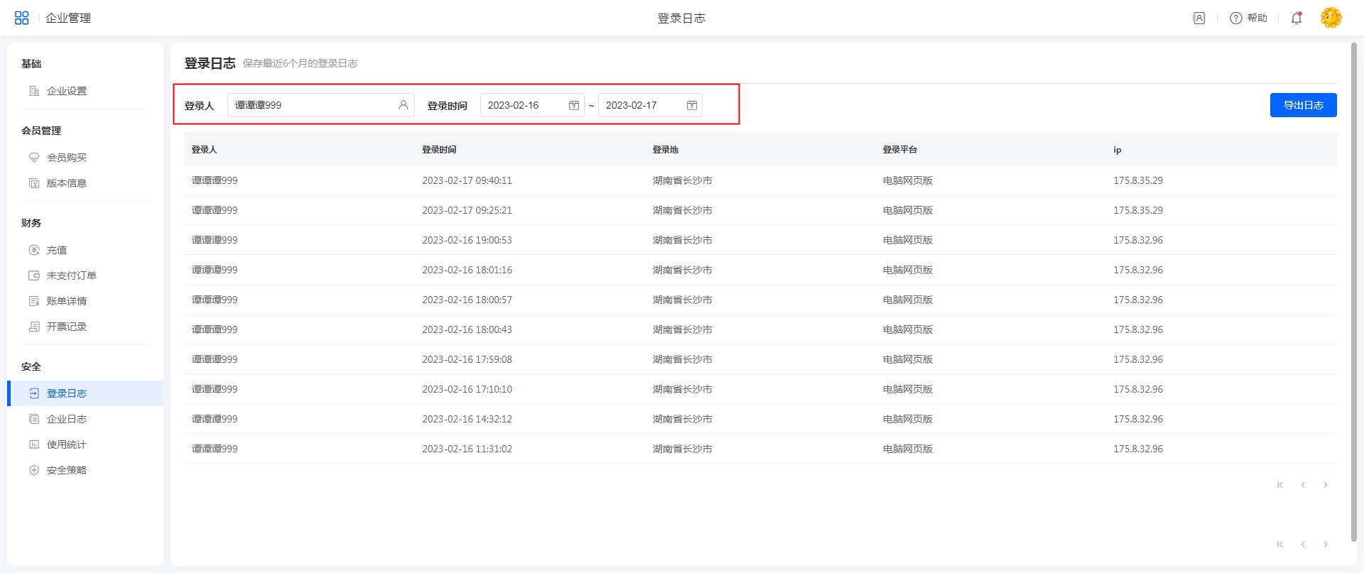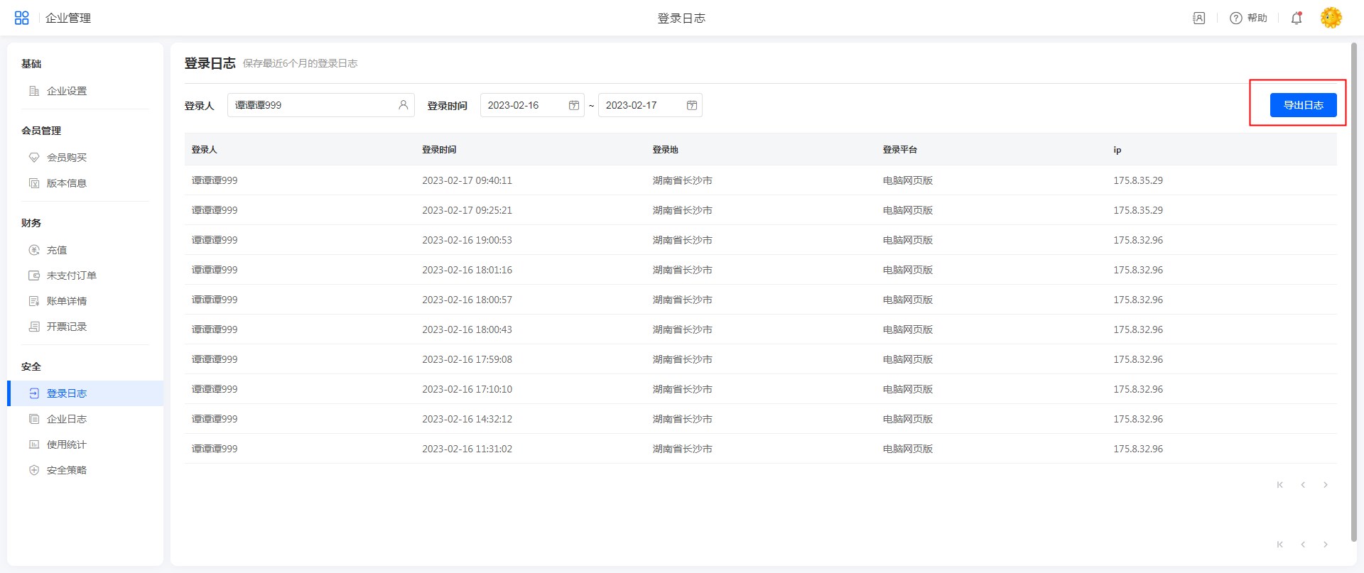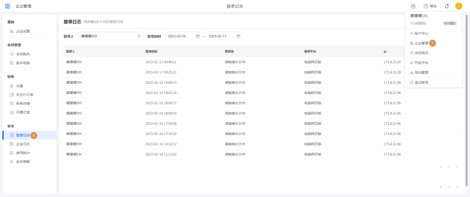 点击头像>>企业管理>>登录日志