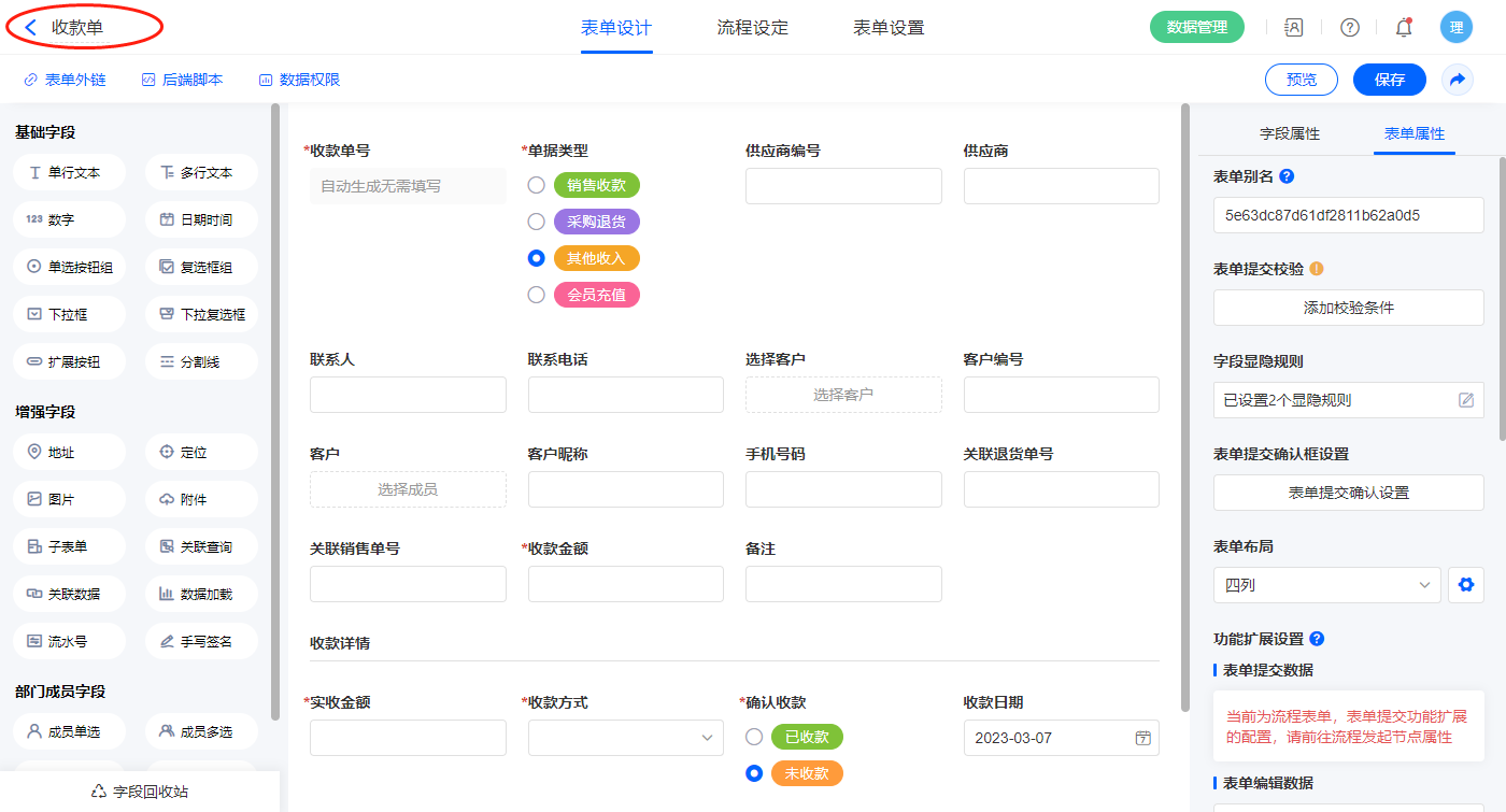 | 关联销售单号 | 单行文本 | 收款金额 | 数字 |