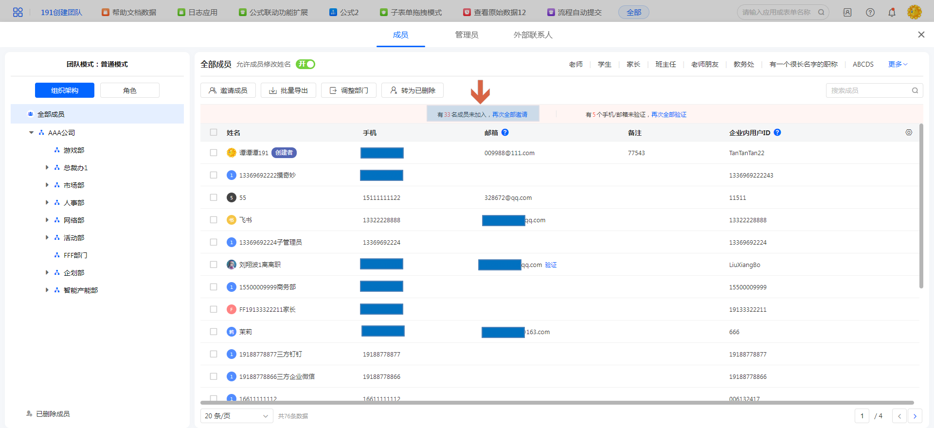 管理员在管理通讯录时,可以给未验证的手机或者邮箱发送验证信息;收到信息后,点击信息中的验证链接激活完成验证。