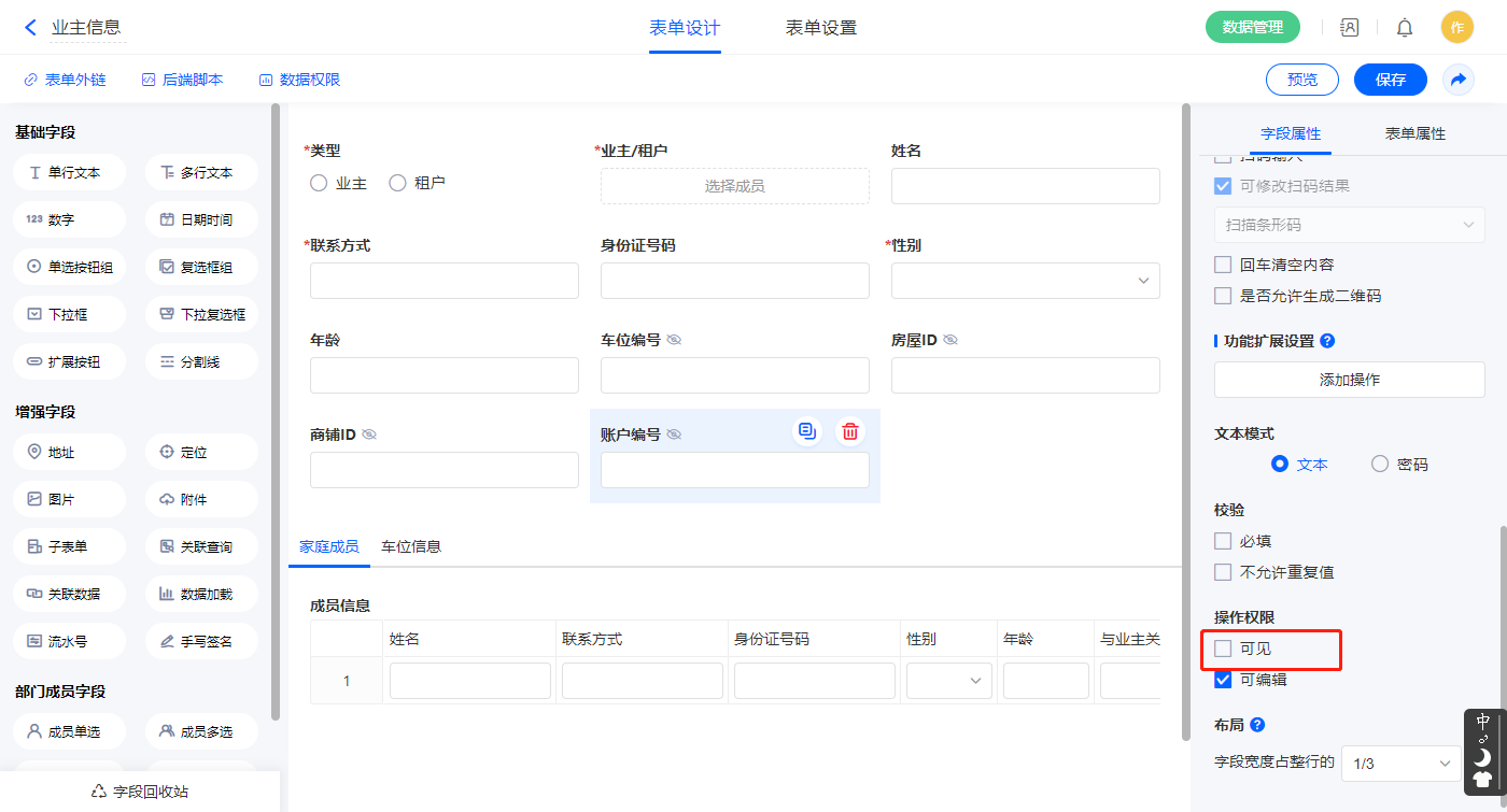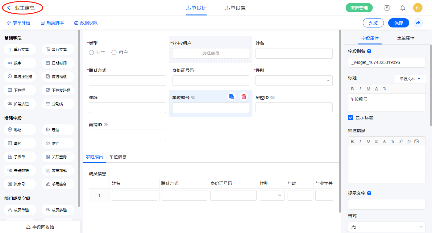 2.2、表单【业主信息】字段及表单属性设置