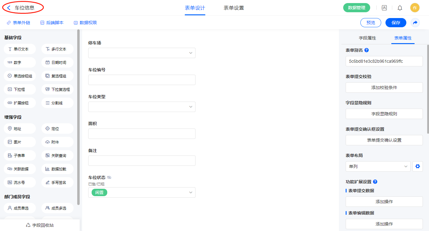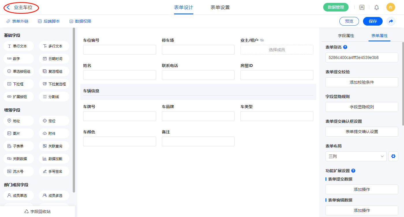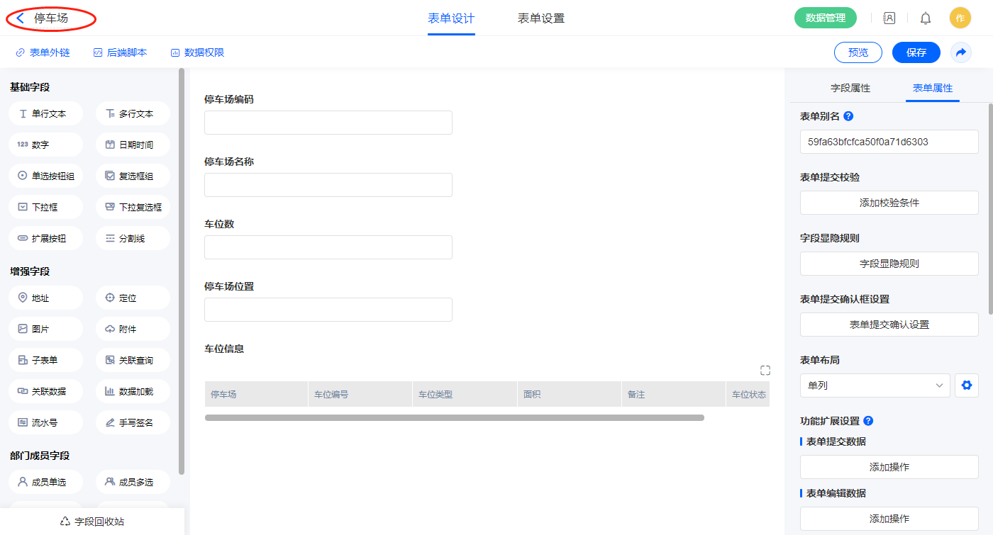 2.3、表单【停车场】字段及表单属性设置