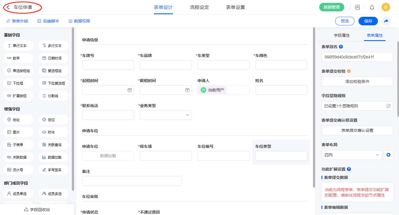 2.4、表单【车位申请】字段及表单属性设置