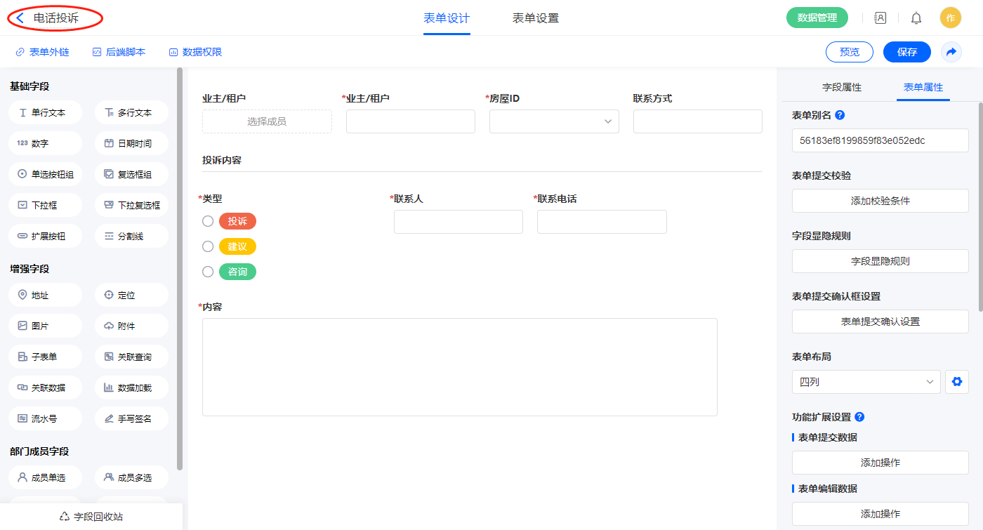 2.5、表单【电话投诉】字段及表单属性设置