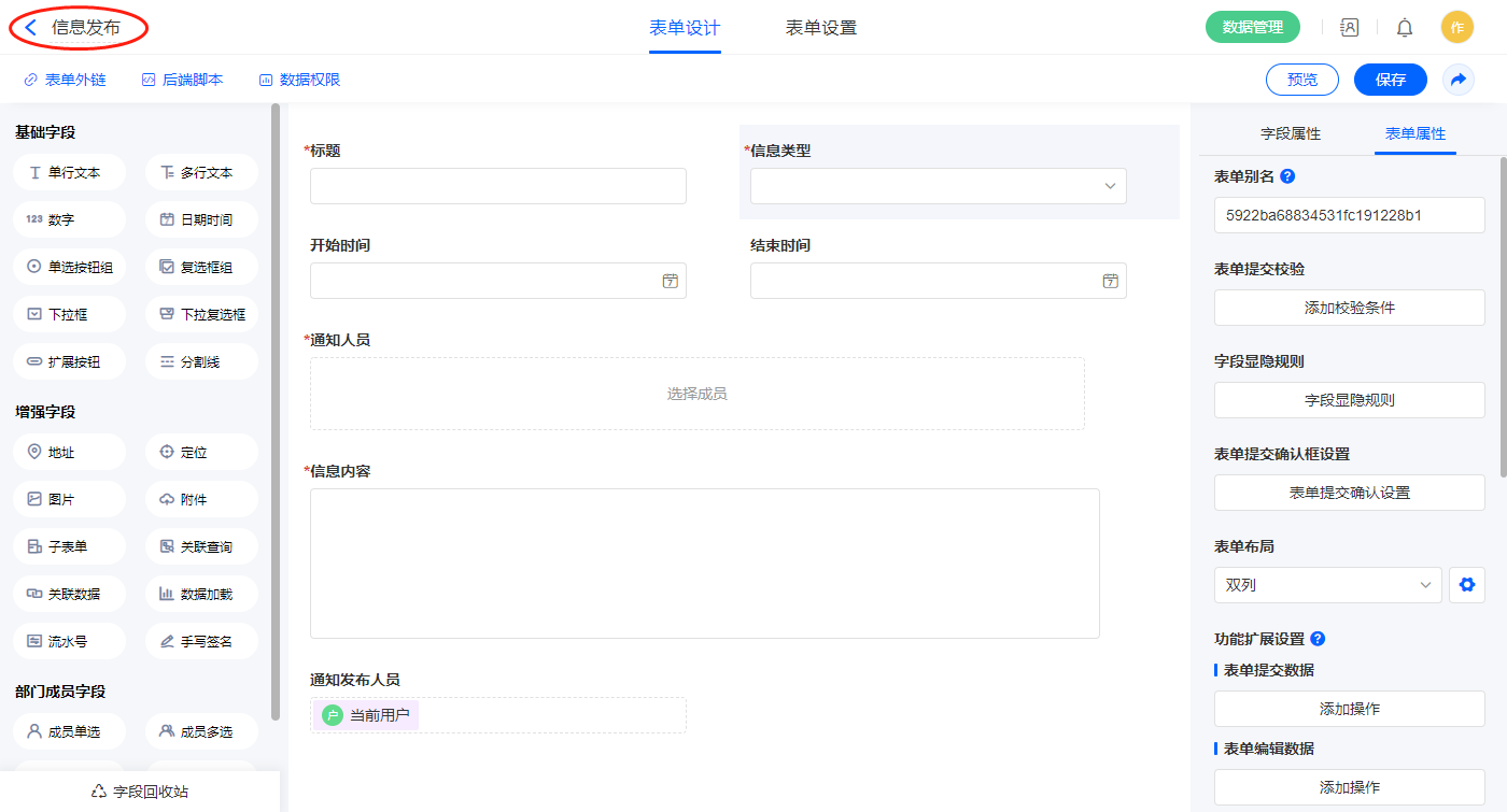 6)新增表单【信息发布】,字段设置如下;