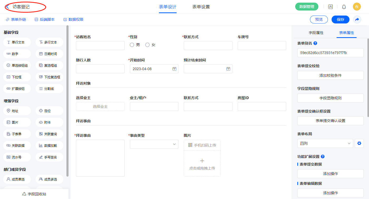 2.6、表单【访客登记】字段及表单属性设置