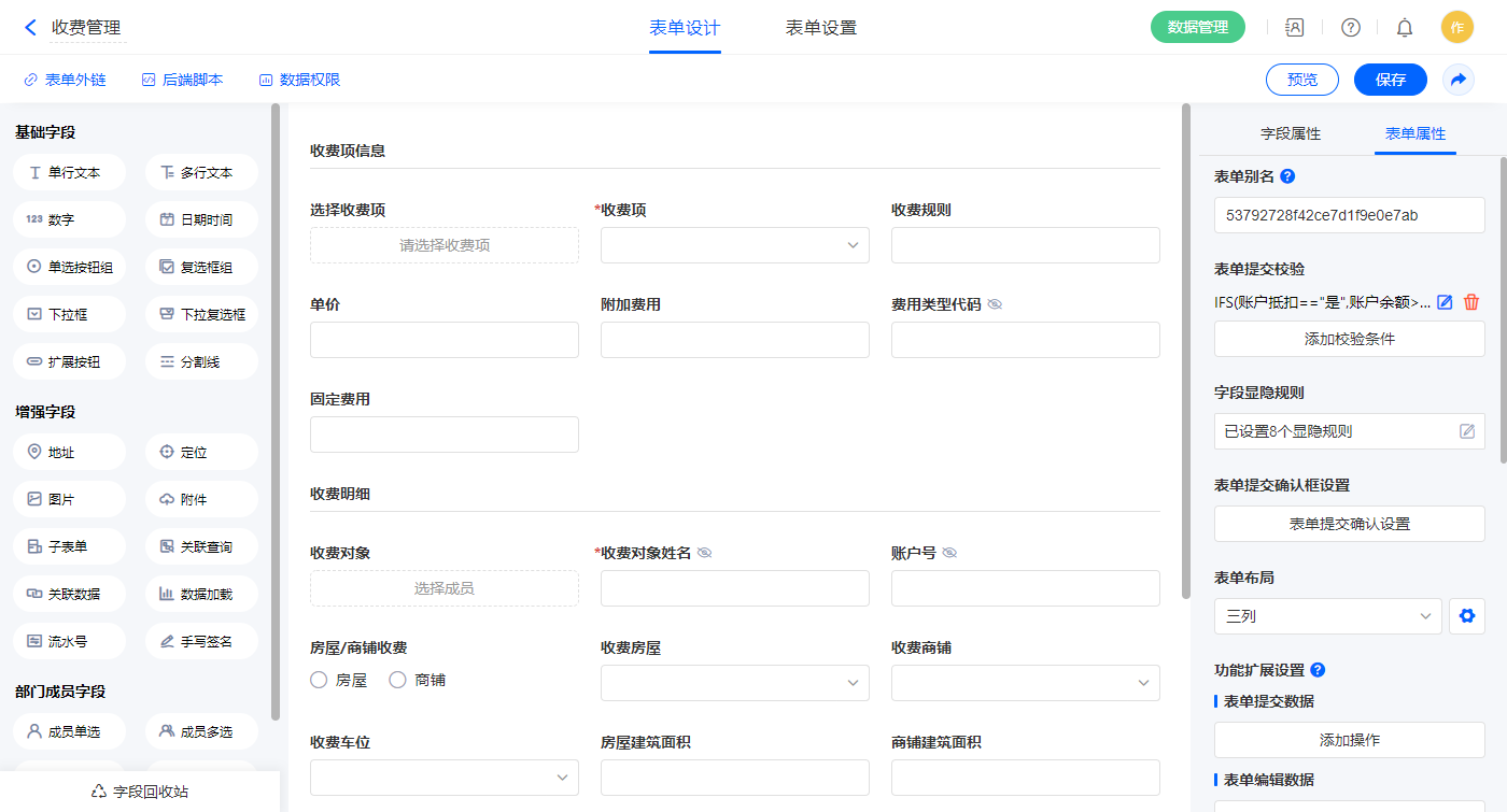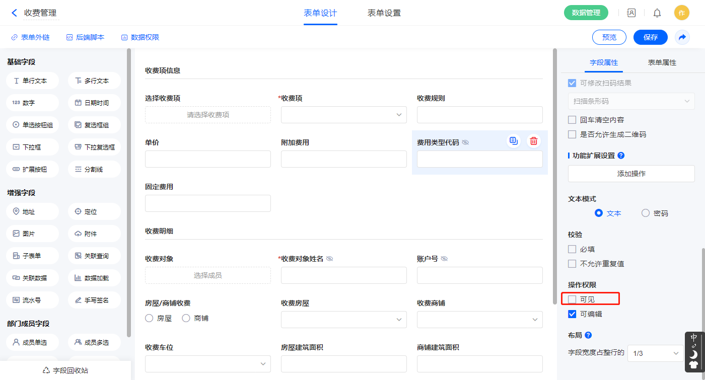 2.8、表单【收费管理】字段及表单属性设置