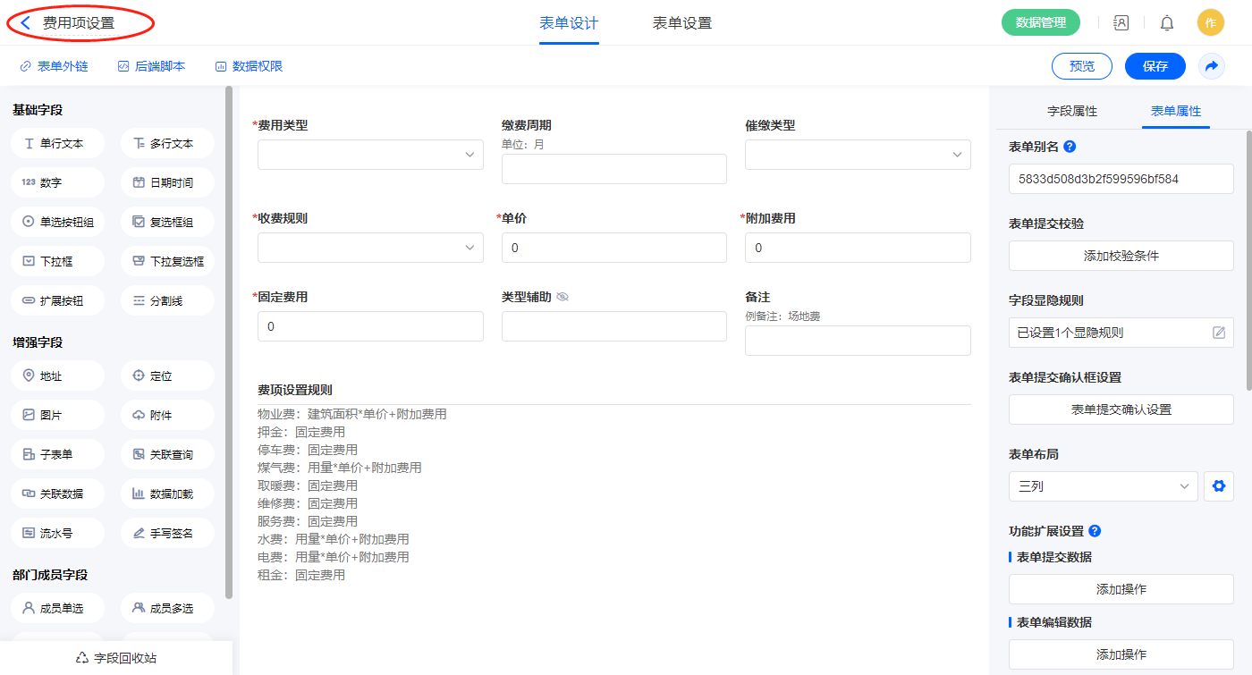 2.7、表单【费用项设置】字段及表单属性设置