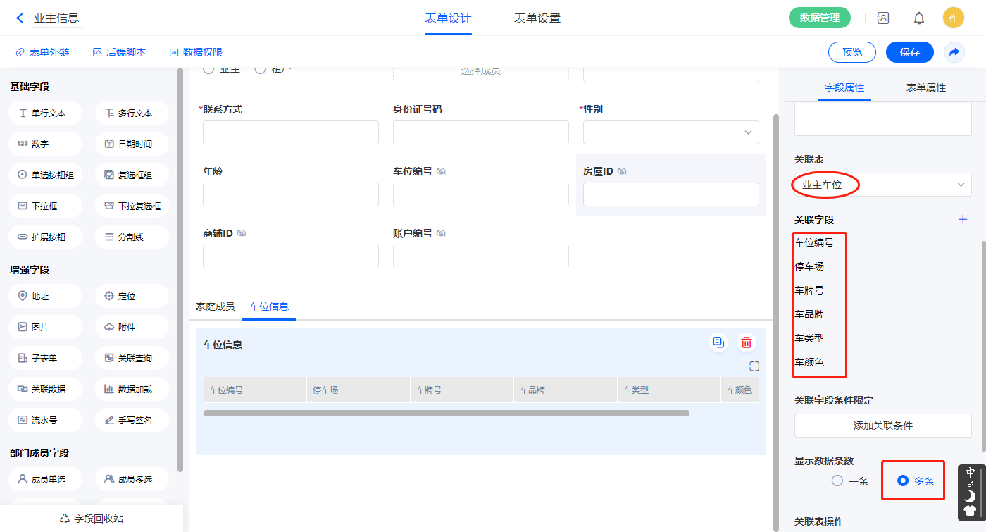 2)【车位信息】关联查询字段,设置关联表为【业主车位】并如图选择关联字段,设置显示数据条数为多条;