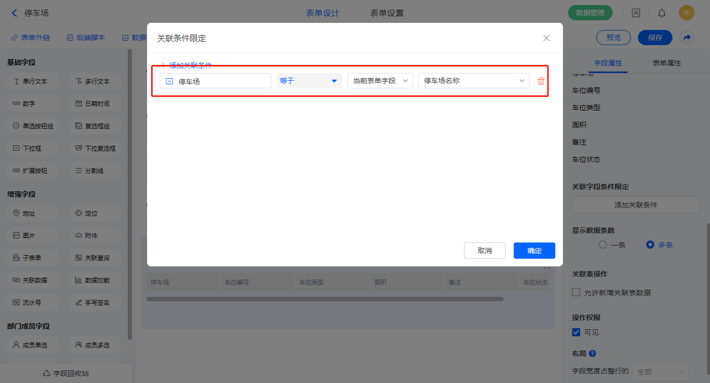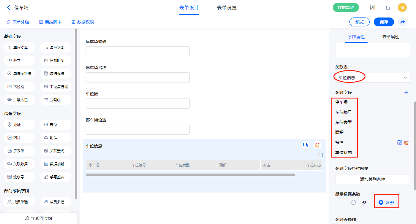 1)【车位信息】关联查询字段,设置关联表为【车位信息】并如图选择关联字段,设置显示数据条数为多条;