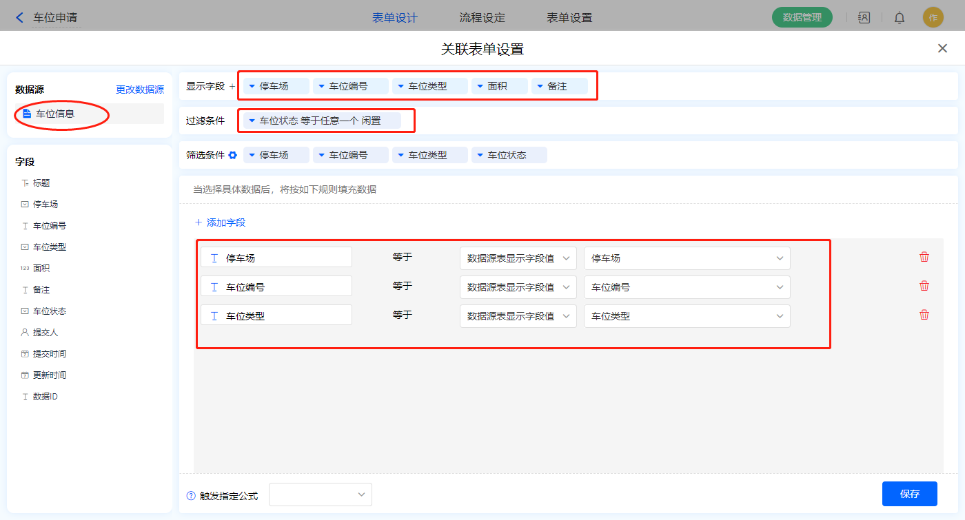 1)【申请车位】数据加载字段,数据源为【车位信息】,添加过滤条件及设置赋值字段;