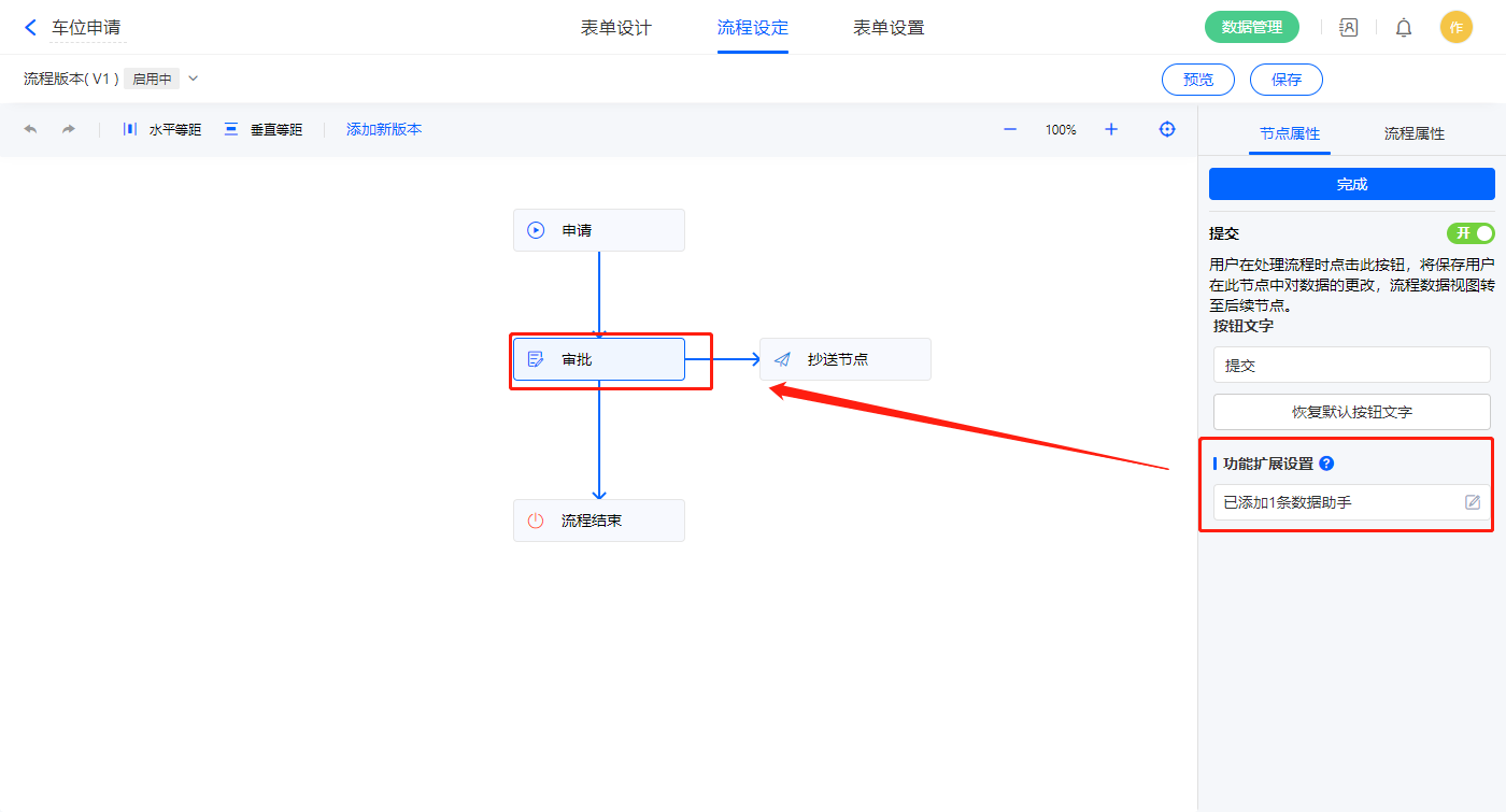 2)该表单为流程表单,设置好流程陈节点,发起节点提交设置一条数据助手,名称为新增业主车辆信息,共三个执行动作;