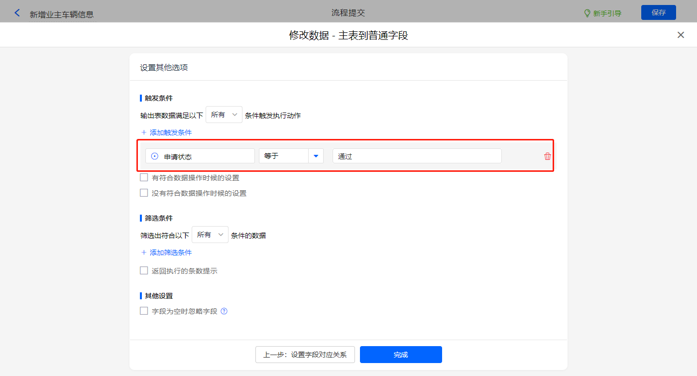 其他设置触发条件为【申请状态】等于通过,设置好点击【完成】并保存该数据助手;