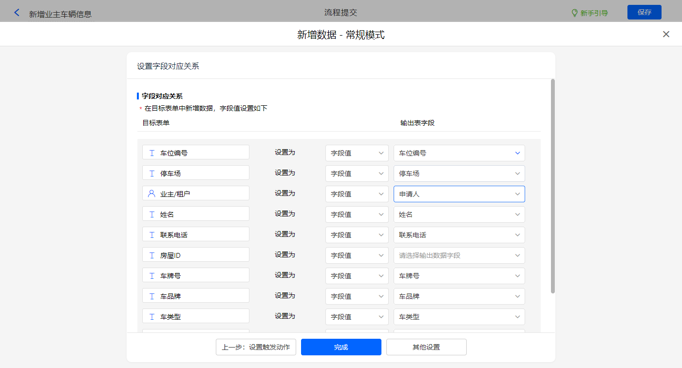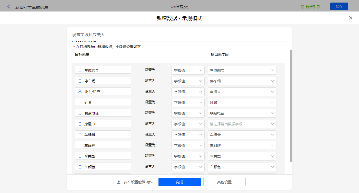 新增新增数据的执行动作,选择目标表单【业主车位】表单,设置对应的赋值字段;