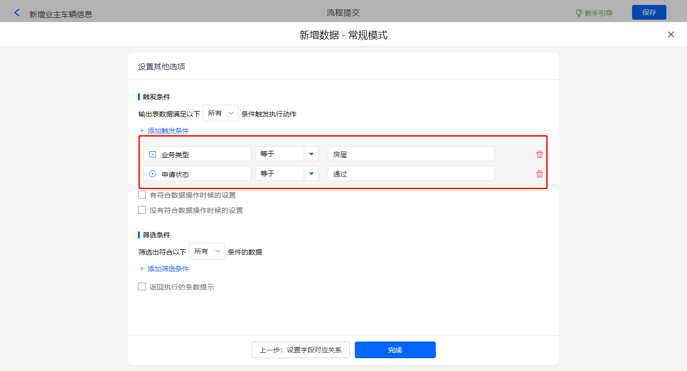 其他设置触发条件为【业务类型】等于房屋且【申请状态】等于通过,设置好点击【完成】并保存该数据助手;