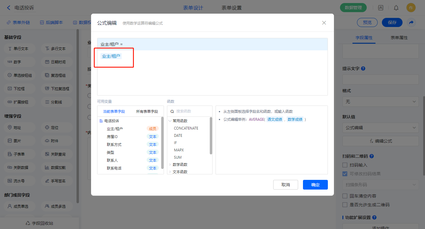 1)【业主/租户】字段,默认值选择公式编辑,如图设置公式;