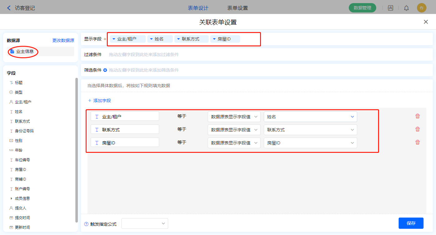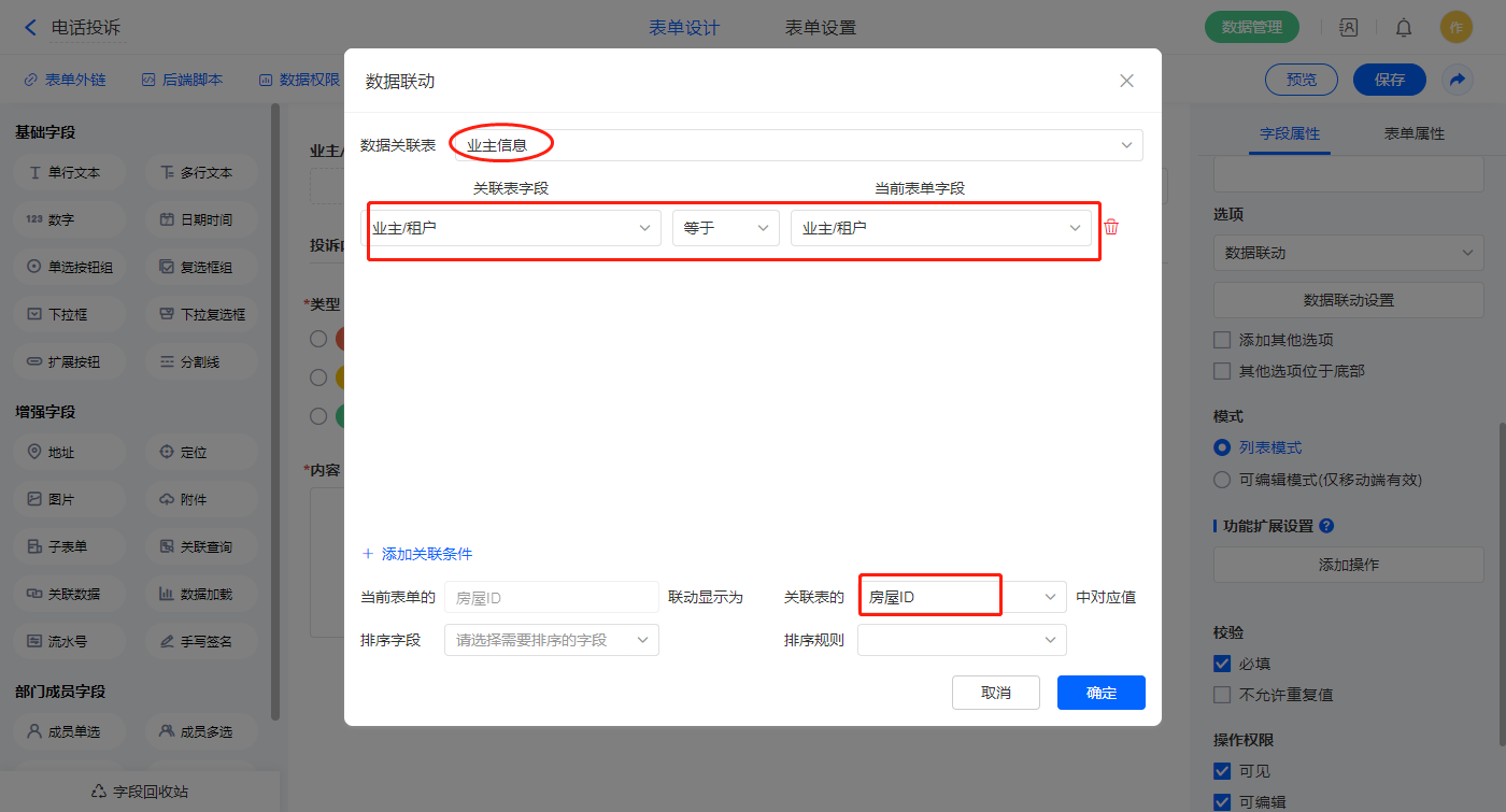 设置关联条件,【业主/租户】字段作为关联条件;