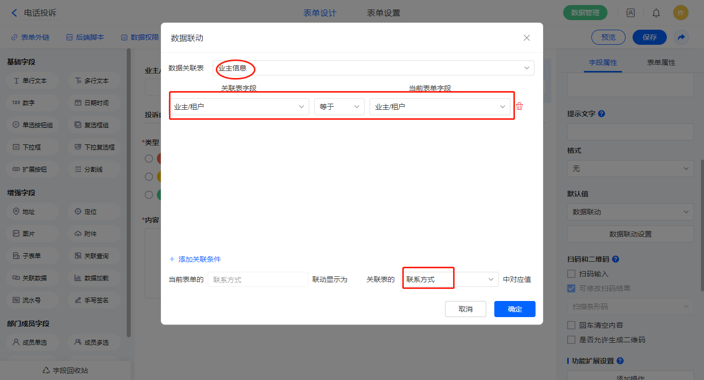 【联系方式】字段,设置默认值为数据联动,设置联动条件及联动字段;