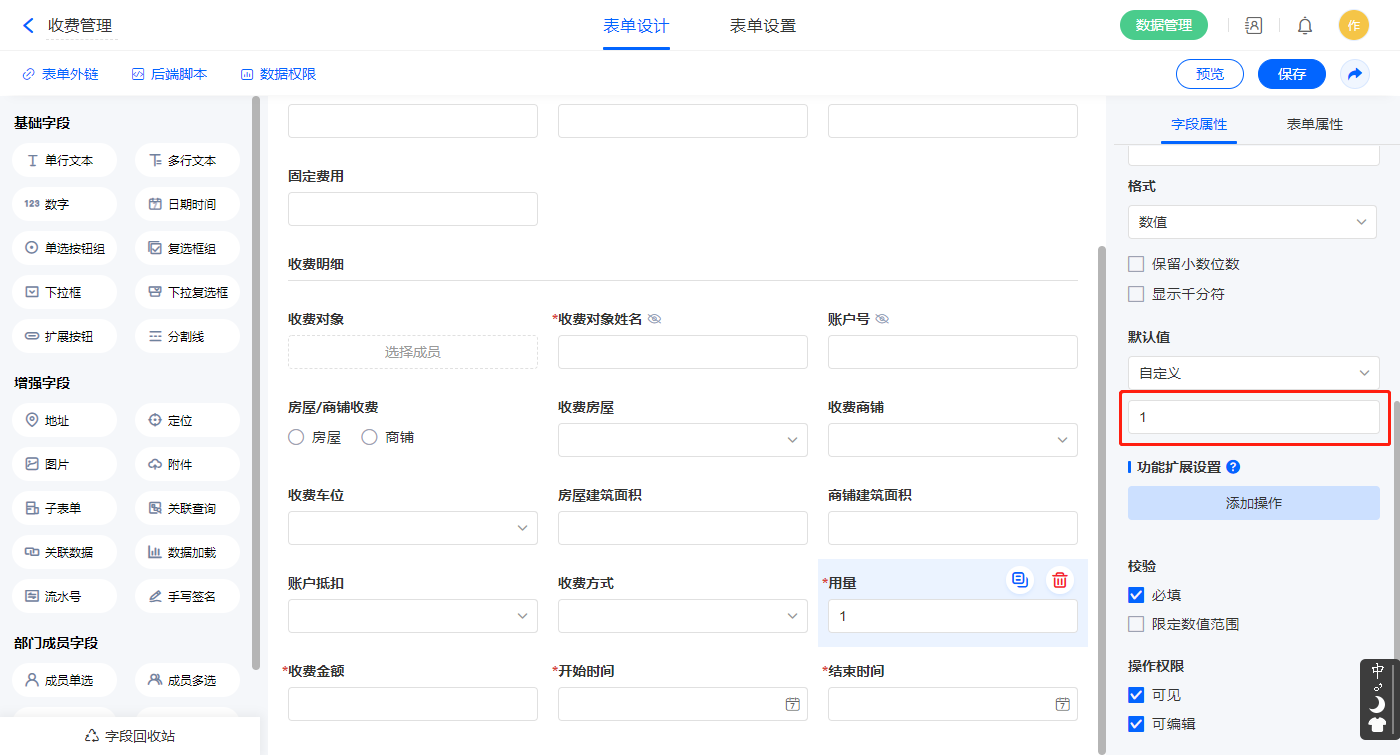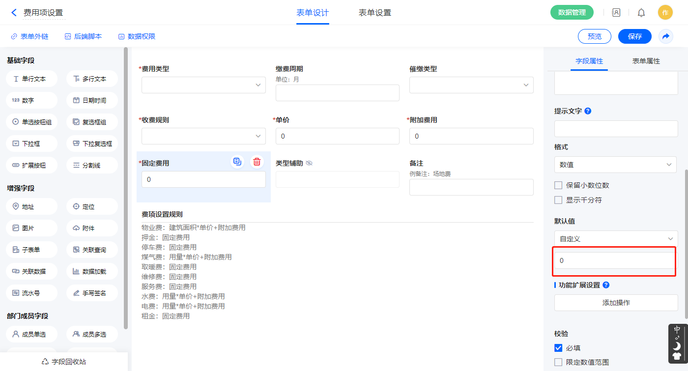 3)【单价】、【附加费用】、【固定费用】字段设置默认值为0;