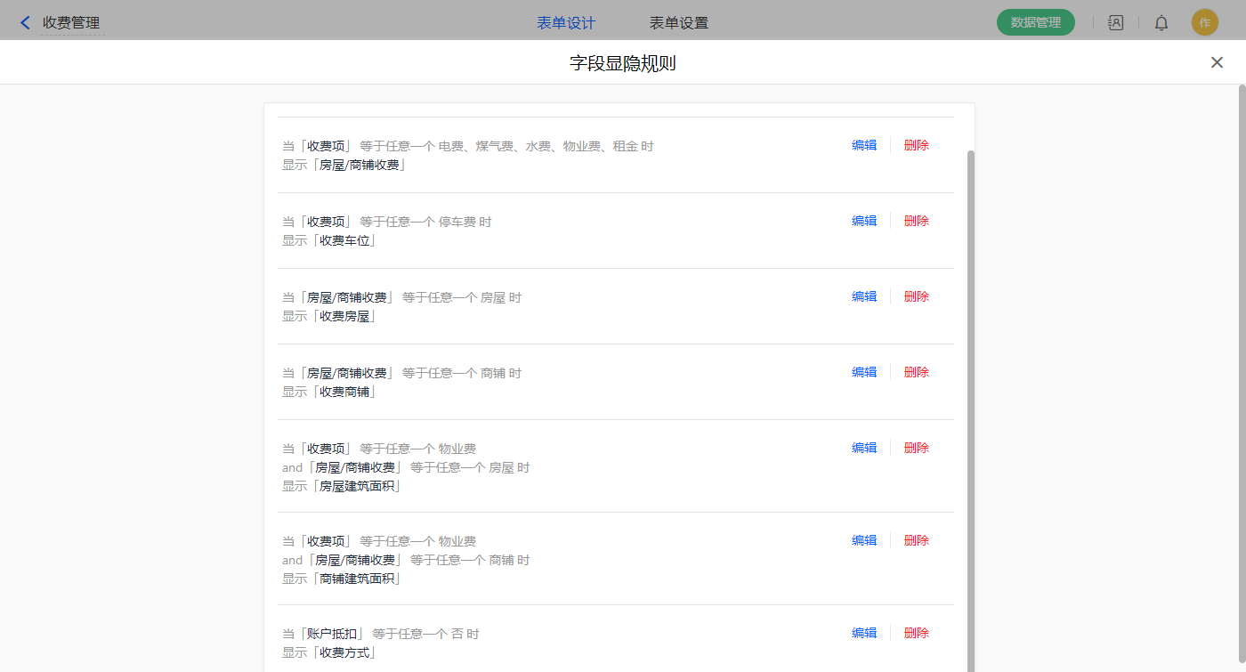 1)设置七条显隐规则: 当【收费项】字段等于任意一个电费、煤气费、水费、物业费、租金显示【房屋/商铺收费】字段; 当【收费项】字段等于停车费显示【收费车位】字段; 当【房屋/商铺收费】字段等于房屋显示【收费房屋】字段; 当【房屋/商铺收费】字段等于商铺显示【收费商铺】字段; 当【收费项】字段等于物业费且【房屋/商铺收费】字段等于房屋显示【房屋建筑面积】字段; 当【收费项】字段等于物业费且【房屋/商铺收费】字段等于商铺显示【商铺建筑面积】字段; 当【抵扣方式】字段等于否显示【收费方式】字段;