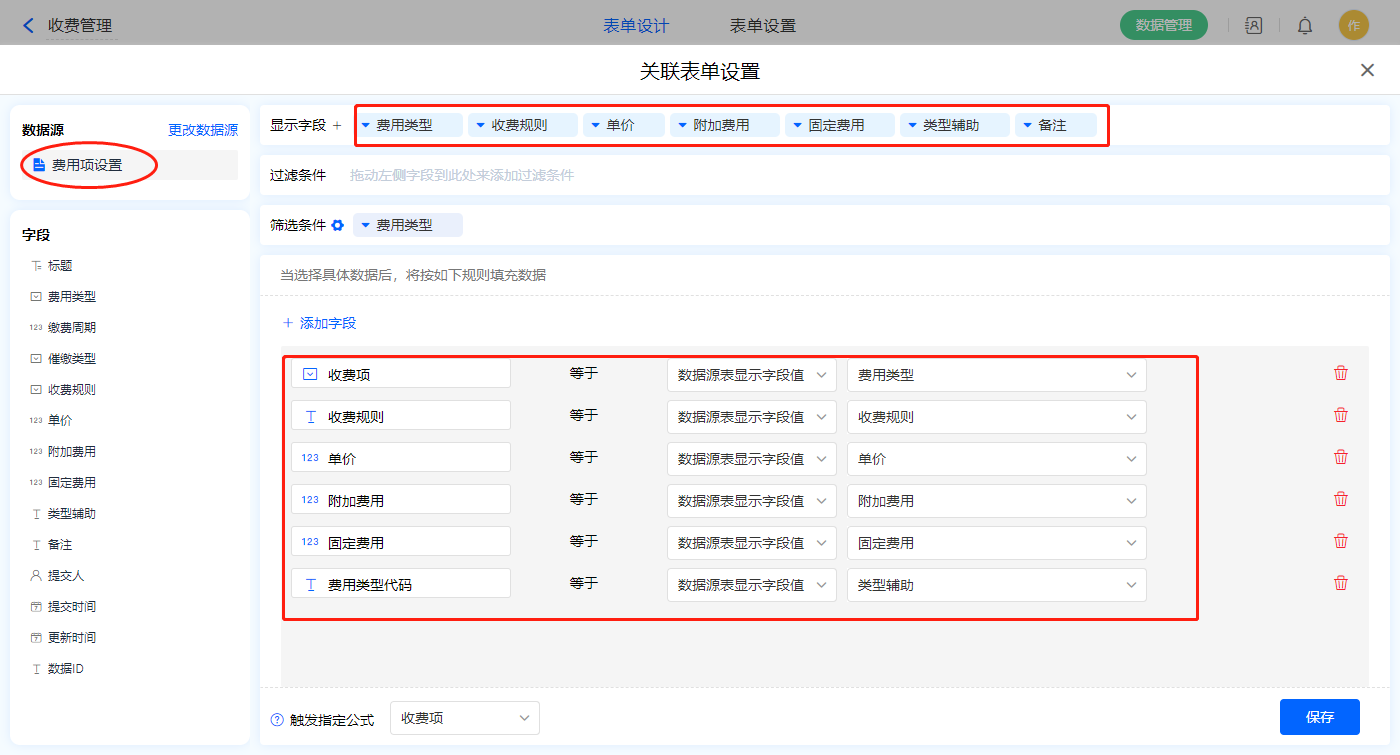 2)【选择收费项】数据加载字段,数据源为【费用项设置】,添加过滤条件及设置赋值字段,触发公式为【收费项】字段;