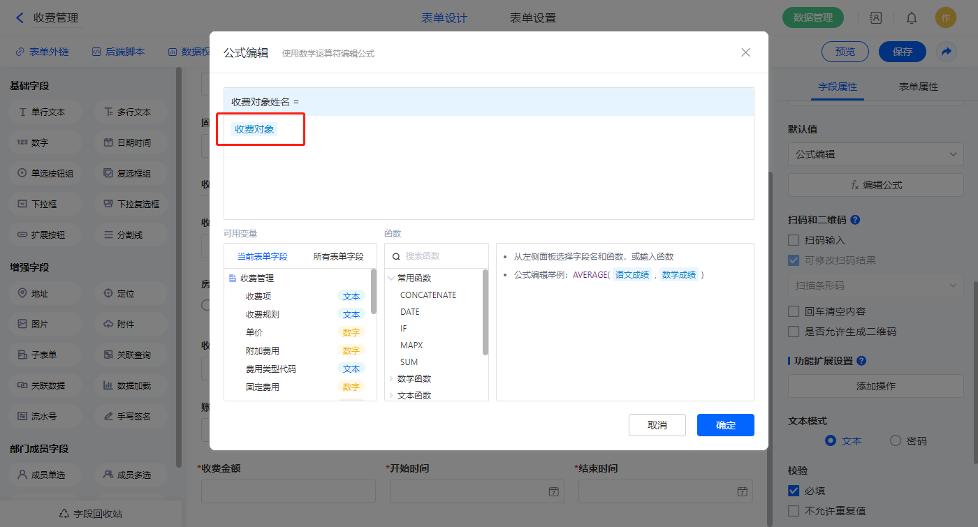 4)【收费对象姓名】字段,设置默认值为公式编辑,如图设置公式;
