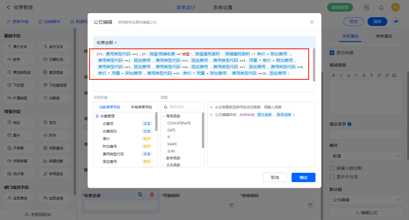 【收费金额】字段,设置默认值为公式编辑,如图设置公式;