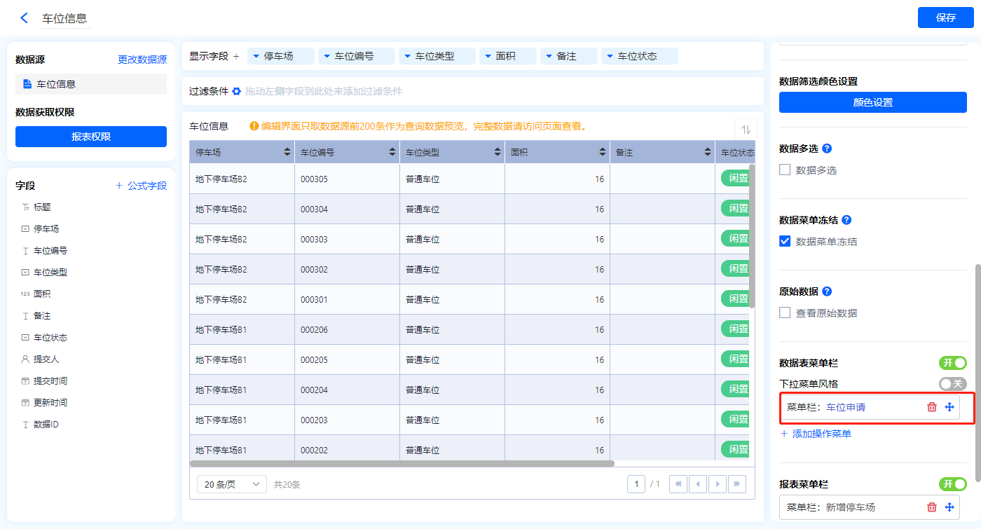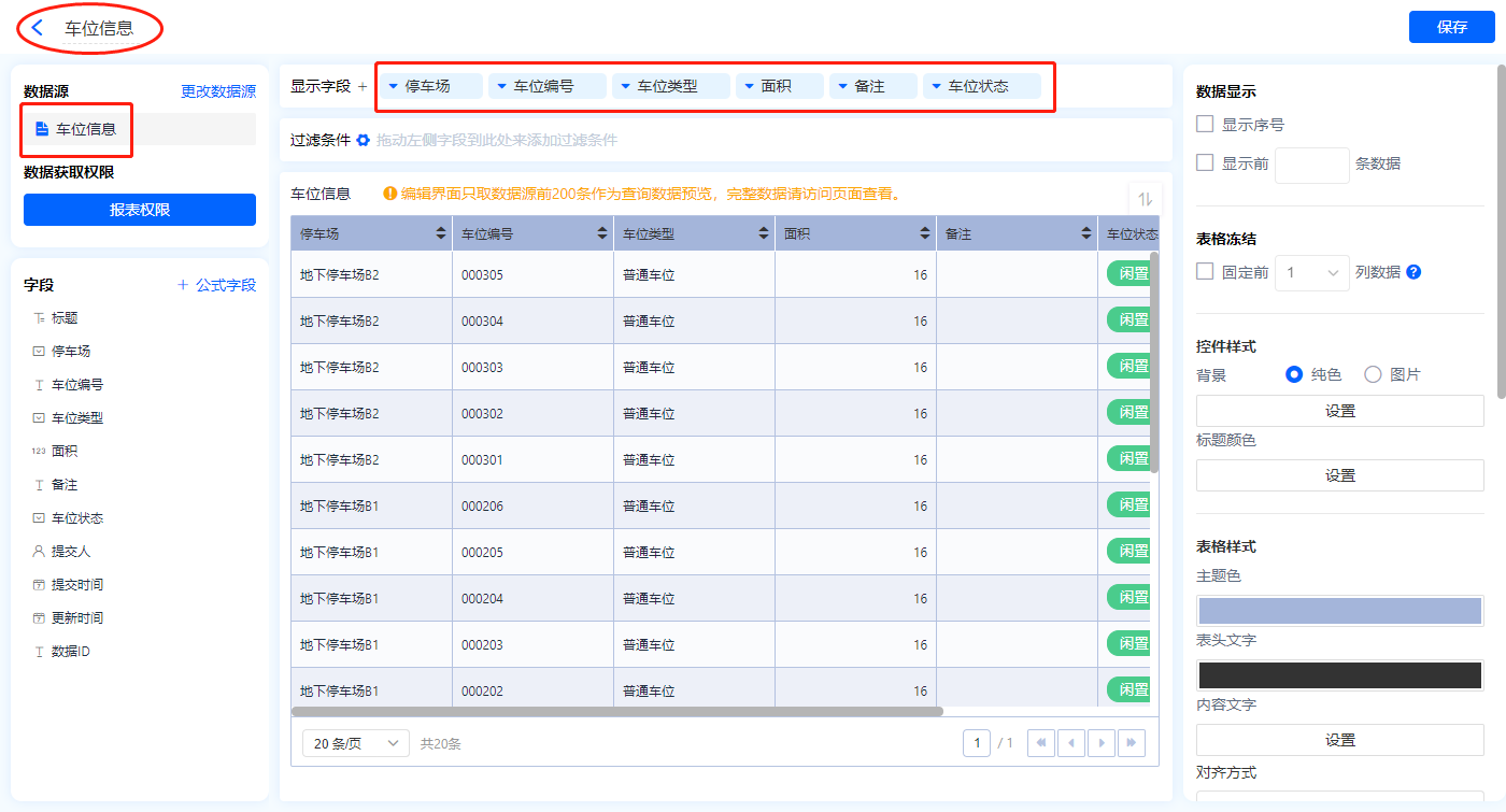 1)新增【停车位管理】报表,用基础报表【数据表】展示数据源为表单【车位信息】的数据;