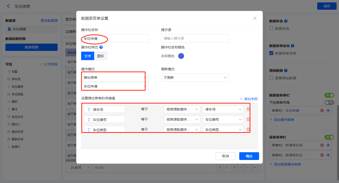 【车位申请】的菜单栏,操作模式设置为弹出表单【车位申请】;